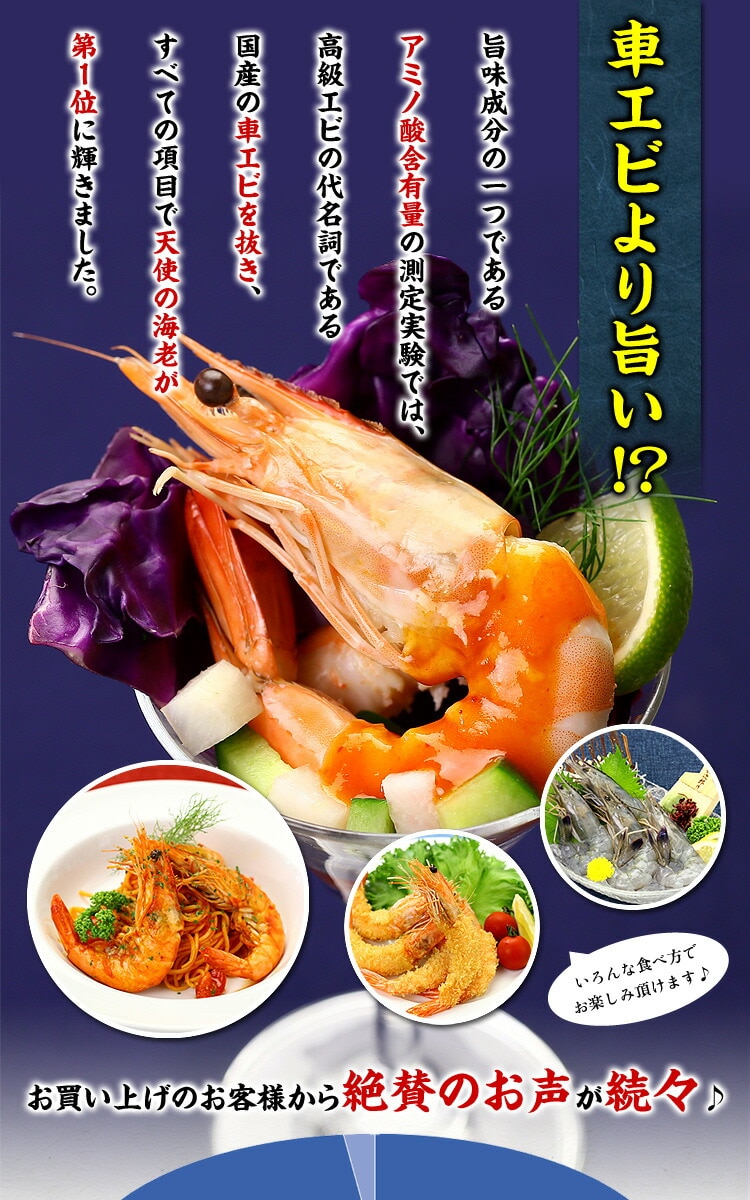 | 今回ご紹介する「天使の海老」は、世界のエビ市場に革命を起こしたとも言われており、その味と品質、安全性において世界最高級の称号を取得。世界中の一流シェフからも絶賛の嵐。東京の銀座や代官山のフランス料理店では、高級食材として重宝されています。抜群の透明度を誇るエメラルドグリーンの海と、どこまでも続く広大なサンゴ礁。世界遺産にも登録されるニューカレドニアのきれいな海で、天使の海老は一切の添加物を使わず、自然食のみで育てられています。限りなく天然に近い環境で養殖しているため、運動量も多く、殻が薄く身が締まっているのが特徴です。これは、ヒゲの長さを見れば一目瞭然で、他の輸入エビとは比べ物にならないほど長く、ストレスなく育った証拠です。また、水揚げされた天使の海老は素早く選別され、生きている状態で、わずか10分という短時間で冷凍処理。旨味成分の一つであるアミノ酸含有量の測定実験では、高級エビの代名詞である国産の車エビをも抜き、すべての項目で天使の海老が第1位という結果になりました。…などなど、ウンチクを語りだすと切りがないほど、他のエビとは一線を画す特徴を持っています。イタリアンやフレンチなど、お料理好きの方には特にお勧めの一品です! |