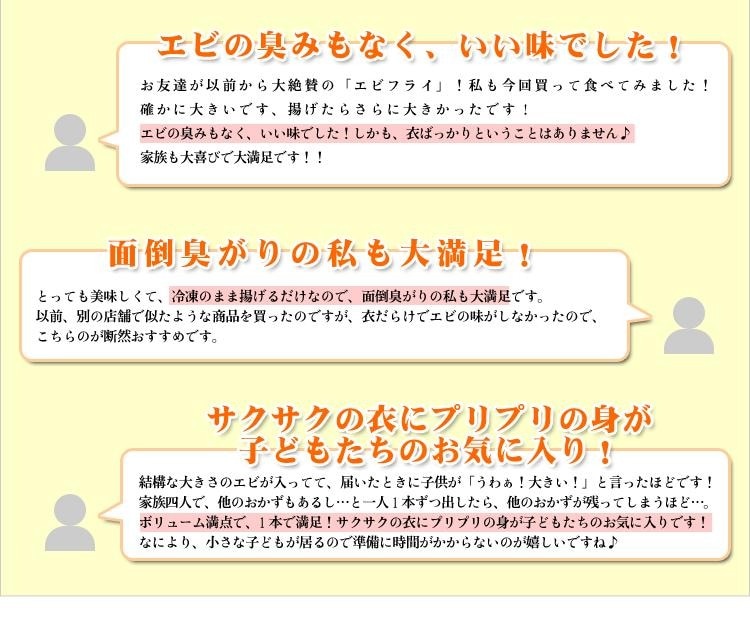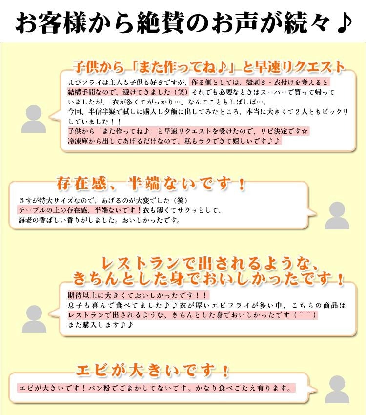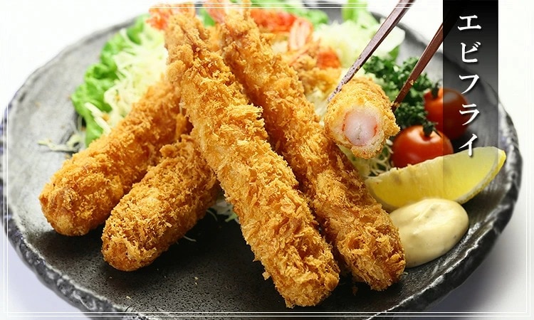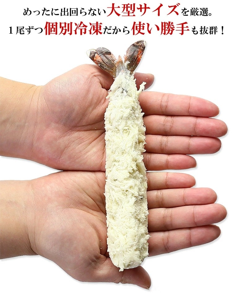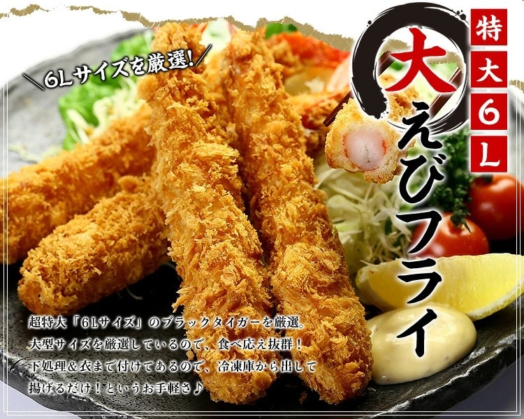 | 超特大6L 大エビフライ10尾(5尾×2パック) ※産地:インドネシア・ベトナム 原材料:えび、食塩、衣(パン粉、小麦粉、鶏卵粉、砂糖、パーム油、食塩、でん粉、粉末状植物性たん白)、加工でん粉、調味料(アミノ酸)、ベーキングパウダー、焼成Ca、pH調整剤、香辛料抽出物、(原材料の一部に大豆を含む) |