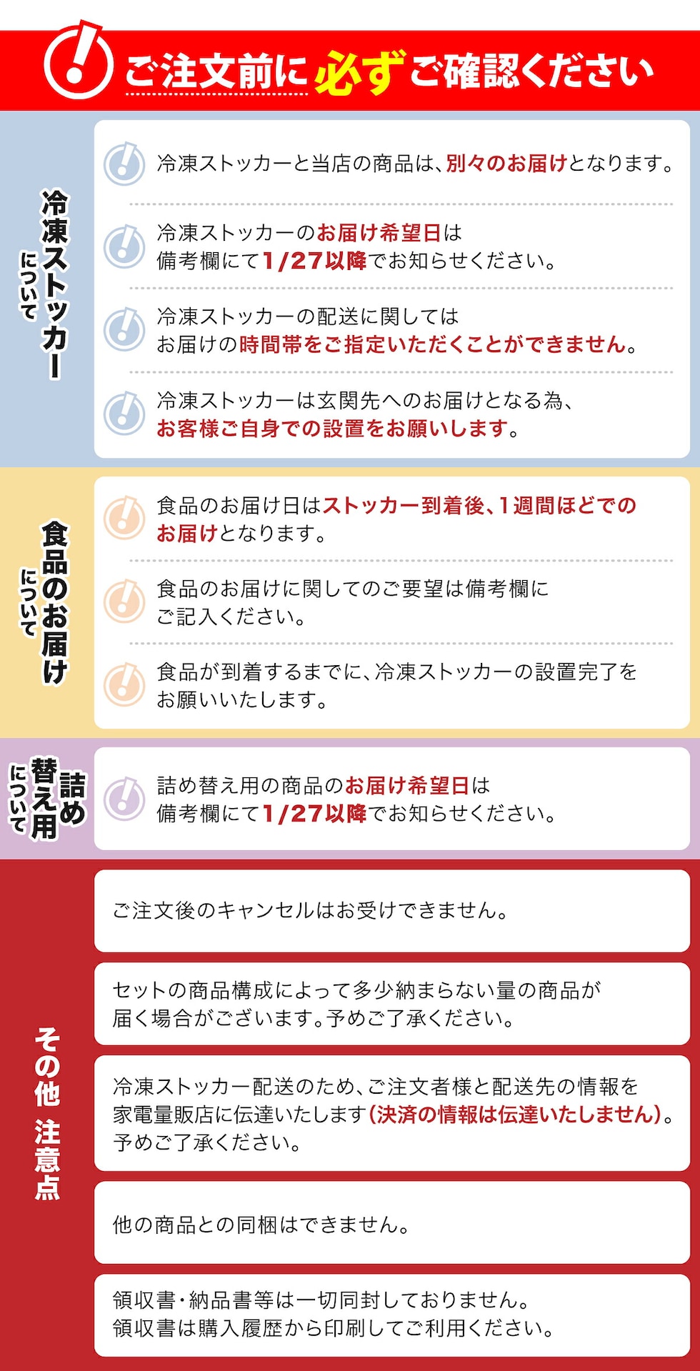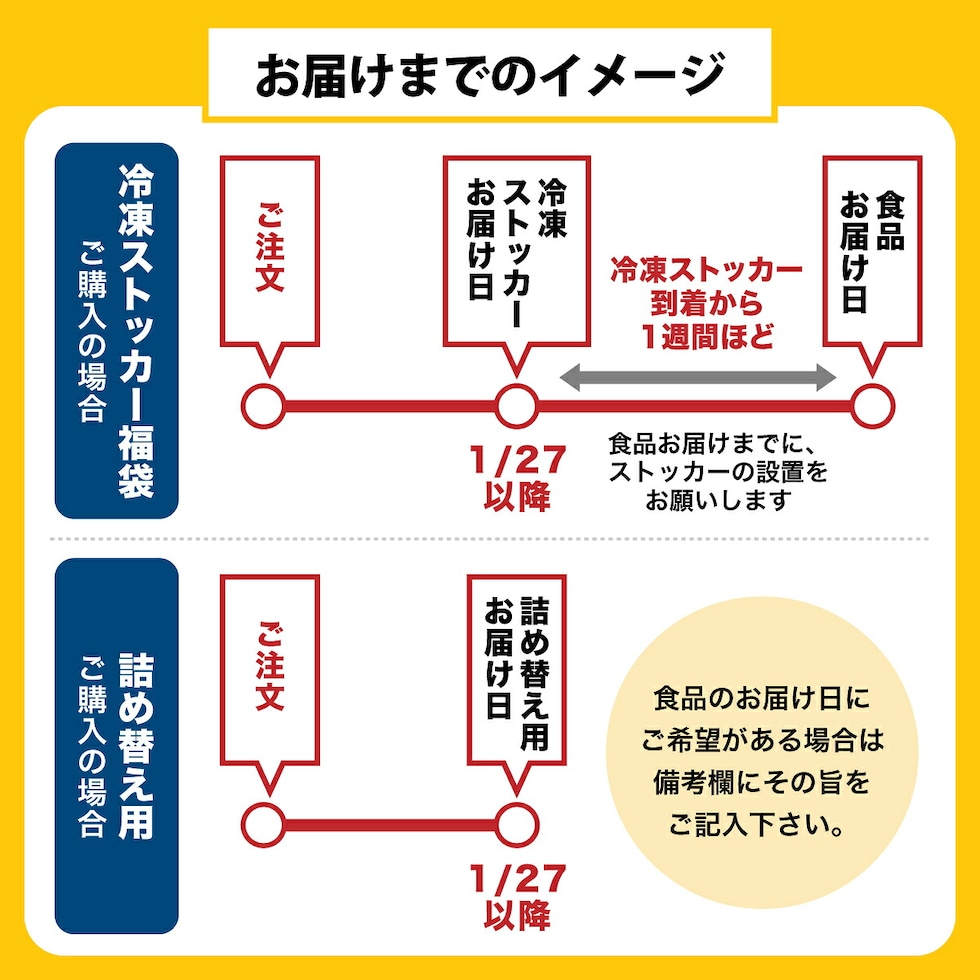 | 注文より4日後以降~30日以内でご指定下さい。※天候・交通等の影響により、ご指定日時にお届けできない場合もございます。 |