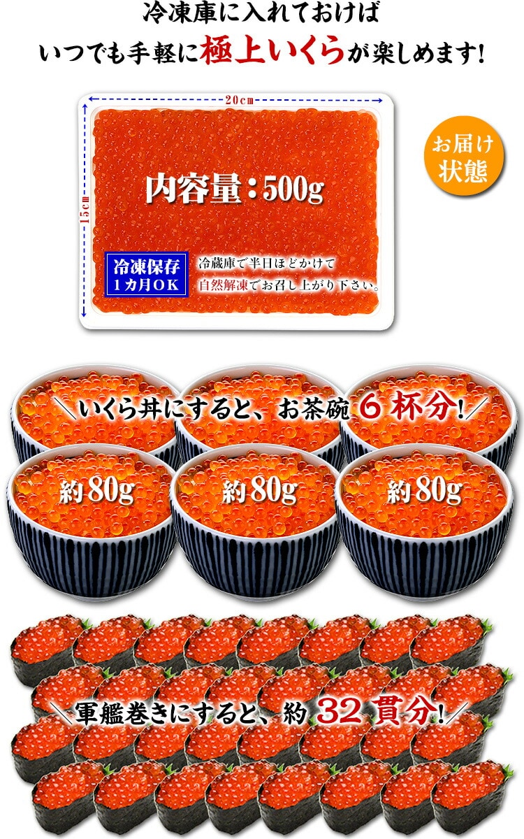 北海道産の高級鮭いくら醤油漬け500g約6人前 いくら イクラ ご飯のお供 冷凍食品 年末年始 正月 お歳暮
