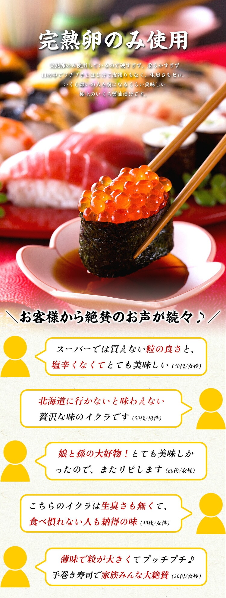 | ◎北海道産の天然秋鮭からとれる筋子を厳選使用! ◎硬すぎず、柔らか過ぎず醤油漬けに最適な卵を厳選! ◎塩分控えめでダシのきいたマイルドな調味液で味付け! ◎業務用たっぷり500g(約6人前)思う存分食べ放題! ◎海鮮丼、手巻き寿司、パスタ、サラダ… 食べ方いろいろ! 鮭の一大漁場である北海道沖の定置網で漁獲される秋鮭に限定し、いくらの最も美味しい時期である9月~10月の完熟卵のみ使用。卵が生きているうちに熟練の職人が取り出し、塩分控えめでダシのきいたマイルドな調味液で味付けしました。プチプチとはじけて皮残りもなく、特有の生臭さもゼロ。瞬間急速冷凍で作りたての美味しさをそのままお届けします。いくら嫌いの人も虜になってしまうくらい美味しい極上のいくら醤油漬けです。ご自宅用や贈り物にも店長@田辺、自信を持ってお勧めいたします。 |