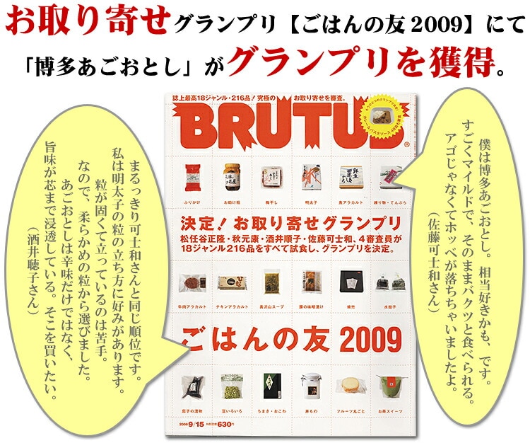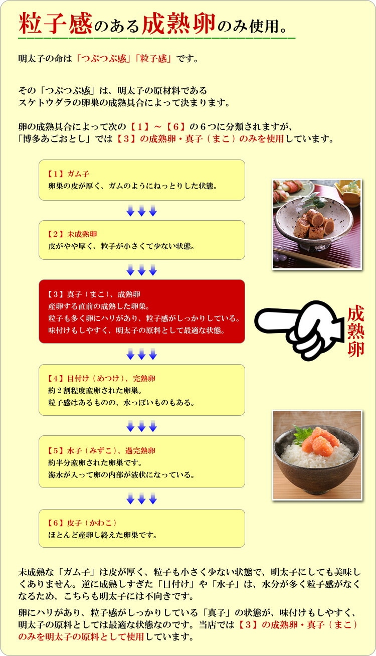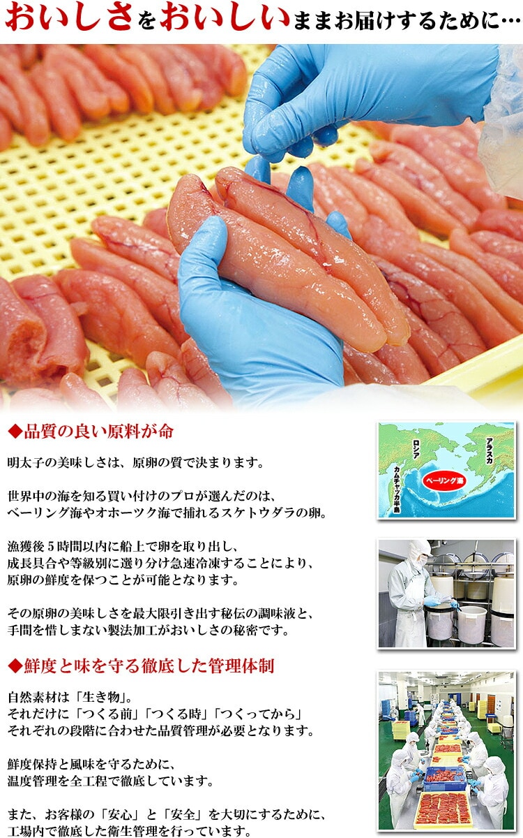明太子の美味しさは、原卵の質で決まります。世界中の海を知る買い付けのプロが選んだのは、アラスカ・ベーリング海、そしてオホーツク海で捕れるスケトウダラの卵。漁獲後5時間以内に船上で卵を取り出し、成長具合や等級別に選り分け急速冷凍することにより、原卵の鮮度を保つことが可能となります。その原卵の美味しさを最大限引き出す秘伝の調味液と、手間を惜しまない製法加工がおいしさの秘密です。「あごが落ちるほどおいしい」というお客様の評判が、そのまま商品名になり、「博多あごおとし」と命名されました。1995年に行われた全国水産加工品総合品質審査会において、名誉ある農林水産大臣賞を受賞。その後もテレビや雑誌で有名芸能人が、博多のお勧め明太子として紹介したり、メディアでの露出も多数。その美味しさと品質の高さが評価されています。 |