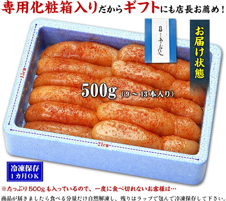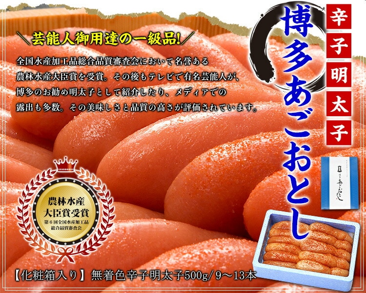 芸能人御用達の高級辛子明太子「博多あごおとし」500g 一本物/無着色 化粧箱入 あごおとし めんたいこ 明太子 年末年始 正月 お歳暮 ギフト