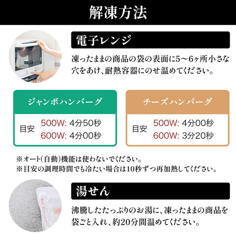 【鉄板焼チーズハンバーグ】 【電子レンジの場合】 凍ったままの商品の袋の表面に5~6ヶ所小さな穴をあけ、耐熱容器にのせ、下記の時間を目安に温めてください。 500W 4分00秒 600W 3分20秒 ※オート(自動)機能は使わないでください。 ※目安の調理時間でも冷たい場合は10秒ずつ再加熱してください。 【湯せんの場合】 沸騰したたっぷりのお湯に、凍ったままの商品を袋ごと入れ、約20分間温めてください。 【蒸し器の場合】 湯気の立った蒸し器に、凍ったままの商品を袋ごと入れ、約21分間温めてください。 ※袋が熱い鍋のふちにふれたり、鍋からはみ出していると、溶ける場合があります。 ※長時間の加熱は、香味低下や中のチーズが溶け出す原因になります。 ※加熱後は袋も中身も熱くなりますので、やけどにご注意ください。 ※一度解凍したものは再び凍結しないでください。 【ジャンボハンバーグ】 【電子レンジ】 【1】凍ったままの商品の袋の表面に5,6カ所小さい穴をあけます。 【2】皿にのせて温めてください。(加熱時間:500Wの場合⇒ 4分50秒、600Wの場合⇒ 4分) 【ボイル】 【1】沸騰したお湯に凍ったままの商品を袋ごと入れます。 【2】フタをせず中火で約14分温めてください。 【3】袋が鍋のふちに触れたりはみ出したりすると袋に穴が開くことがありますので、たっぷりのお湯で温めてください。 |