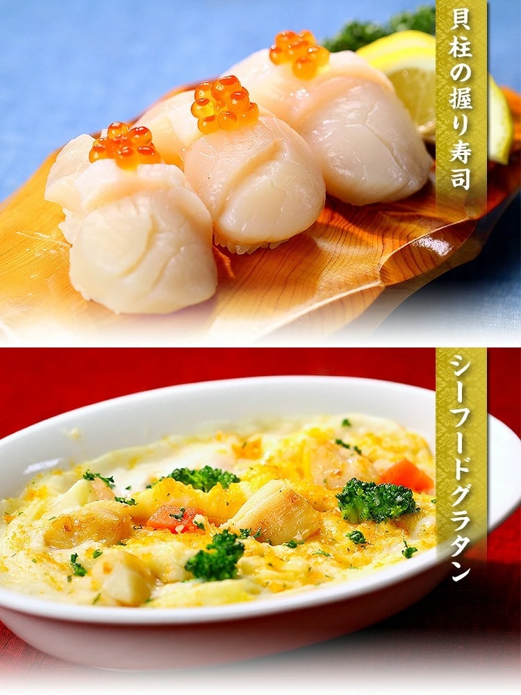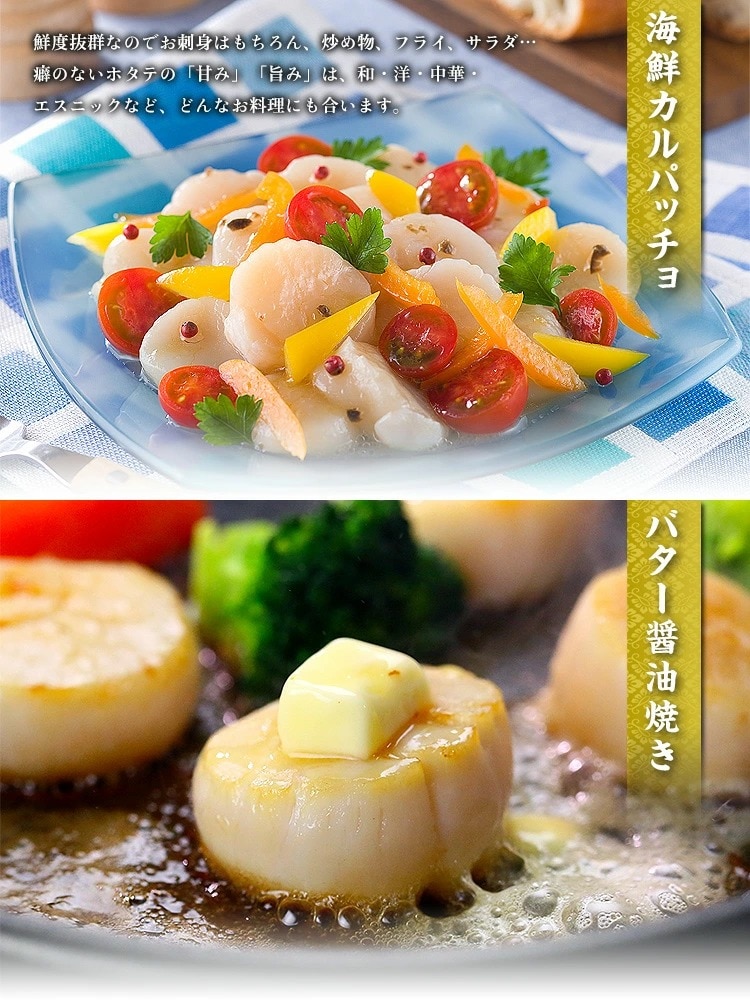 ★極寒の北海道産の鮮度抜群お刺身用貝柱! ★ボリューム満点たっぷり1kg!夢のホタテ貝柱食べ放題!br> ★IQF(1個ずつ個別急速冷凍)なので保存も便利! ★お刺身、炒め物、煮物、揚げ物…食べ方いろいろ! 極寒の北海道では最高級のホタテ貝が育ちます。つややかな飴色でぷりっとした肉厚感。お刺身で食べると舌の上でとろけるような食感と濃厚でコクのある甘みがなんとも言えません!バターでサッと炒めれば表面はカリッ、中はプリプリ♪お醤油or塩コショウで味付けすればできあがり。癖のないホタテの旨みは、どんな料理にもよく合います。 |