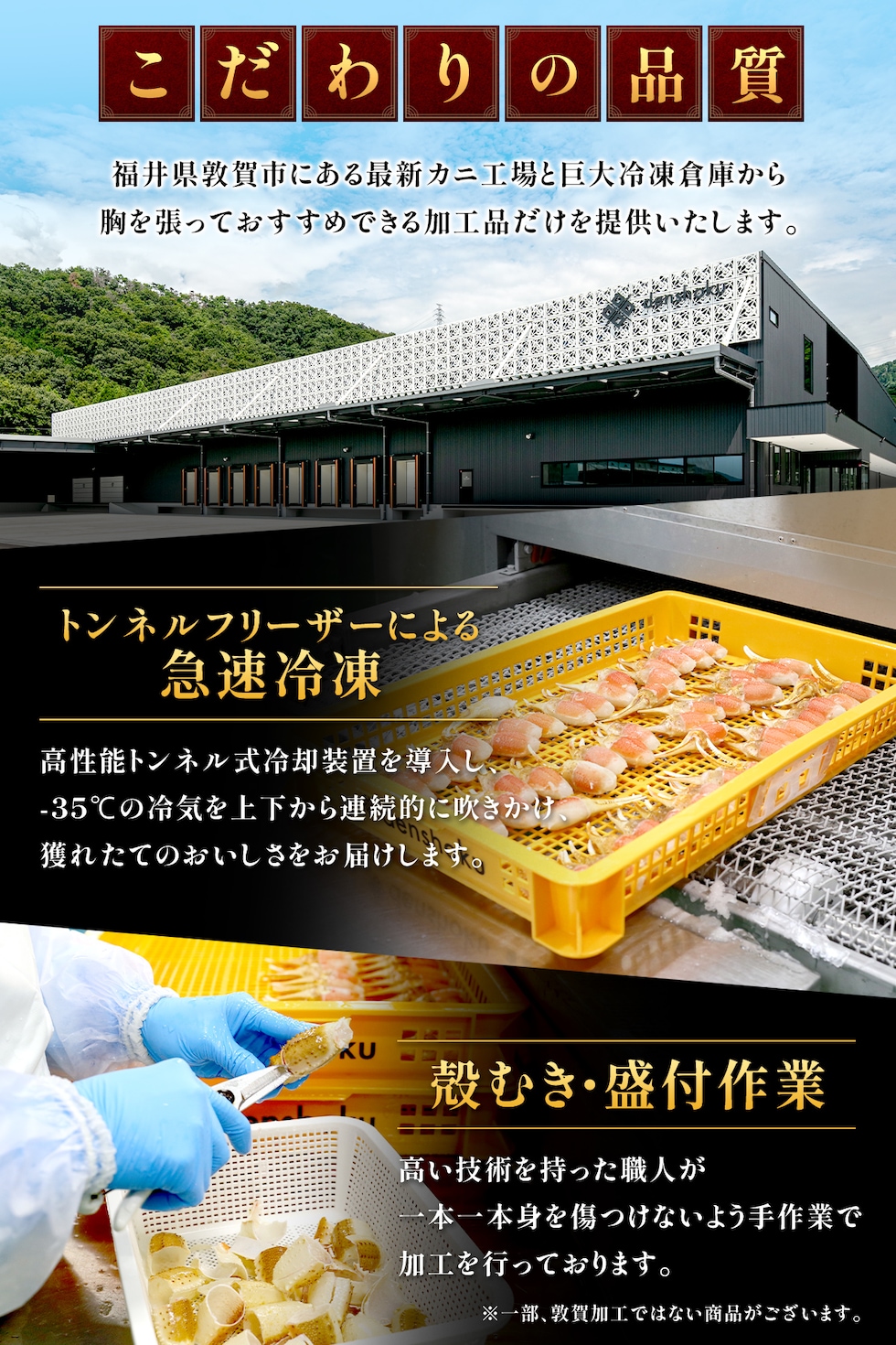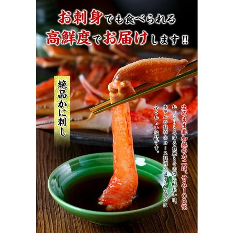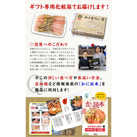 | ★TVのグルメ番組や雑誌のお取り寄せコーナーでの紹介多数! ★お客様満足度90%以上の高評価!絶賛のお声が続々♪ ★カット済みだから包丁や調理バサミ不要で食べやすい! ★お刺身でも食べられる高鮮度!鍋・焼き・しゃぶ…食べ方いろいろ! ★専用化粧箱&食べ方の説明書&のし対応!贈り物にもお薦め! 「カニは好きだけど、食べるのが面倒…」「食べるのに夢中になって、無言になってしまう…」「身の詰まっていない不良品が送られてきそう…」そんなお客様のお声をもとに、この【カット生ずわい蟹】は2011年に開発された商品です。新鮮なズワイガニを厳選し、包丁や調理バサミがなくても簡単に食べられるように、カニの足を1本ずつ職人が丁寧にカットしてお届けしております。販売開始から5年目─、ついにお刺身でも食べられる商品化に成功しました。カニ本来の甘味が繊維の一本一本にぎっしりと詰っていて、まさに「とろける甘さ」が絶品です!カニ刺し、しゃぶしゃぶ、鍋、雑炊、焼きガニ、てんぷら…専門店でしか食べられない本格かに料理のフルコースを、家族みんなで手軽に、存分にお楽しみ頂けると確信しております。 |