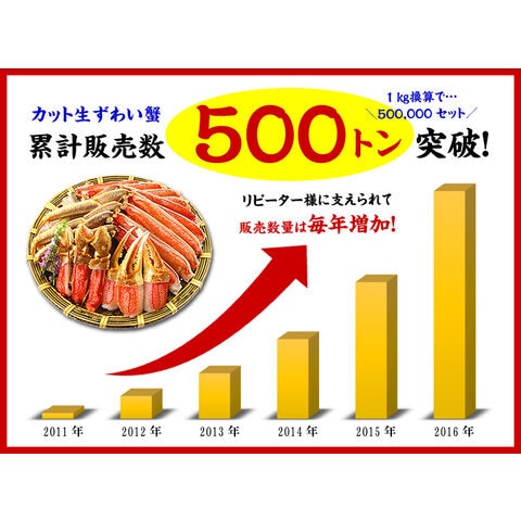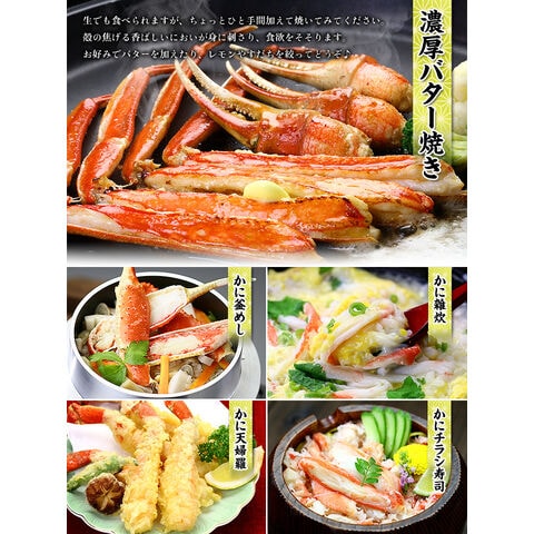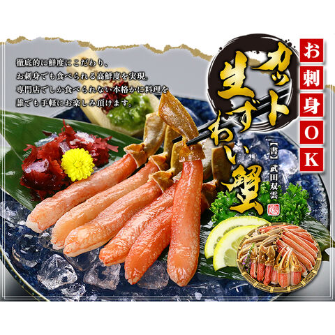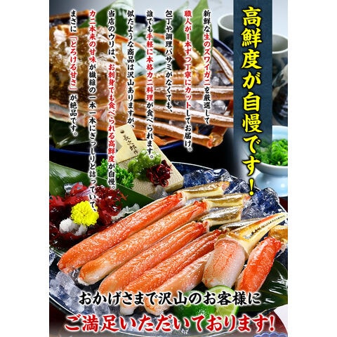 ★TVのグルメ番組や雑誌のお取り寄せコーナーでの紹介多数! ★お客様満足度90%以上の高評価!絶賛のお声が続々♪ ★カット済みだから包丁や調理バサミ不要で食べやすい! ★お刺身でも食べられる高鮮度!鍋・焼き・しゃぶ…食べ方いろいろ! ★専用化粧箱&食べ方の説明書&のし対応!贈り物にもお薦め! 「カニは好きだけど、食べるのが面倒…」「食べるのに夢中になって、無言になってしまう…」「身の詰まっていない不良品が送られてきそう…」そんなお客様のお声をもとに、この【カット生ずわい蟹】は2011年に開発された商品です。新鮮なズワイガニを厳選し、包丁や調理バサミがなくても簡単に食べられるように、カニの足を1本ずつ職人が丁寧にカットしてお届けしております。販売開始から5年目─、ついにお刺身でも食べられる商品化に成功しました。カニ本来の甘味が繊維の一本一本にぎっしりと詰っていて、まさに「とろける甘さ」が絶品です!カニ刺し、しゃぶしゃぶ、鍋、雑炊、焼きガニ、てんぷら…専門店でしか食べられない本格かに料理のフルコースを、家族みんなで手軽に、存分にお楽しみ頂けると確信しております。 |