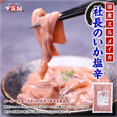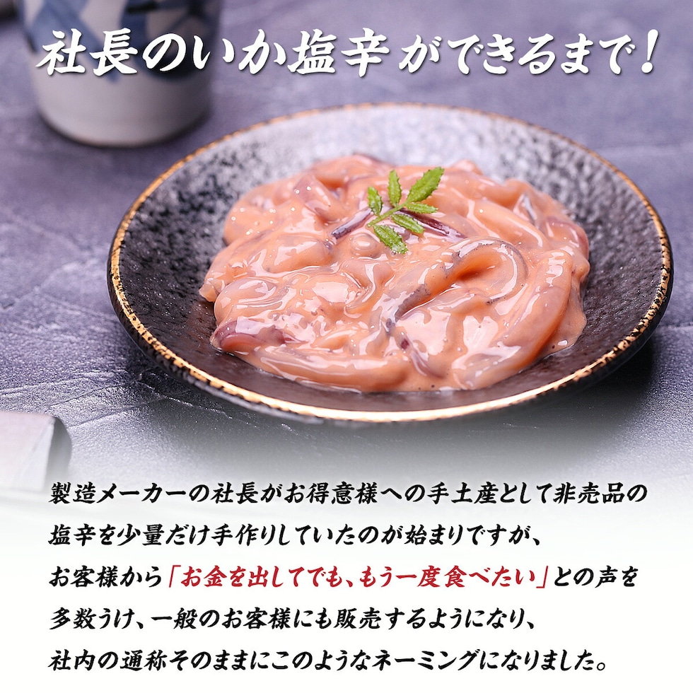 | 国産スルメイカとミネラル分を多く含む沖縄の塩「シママース」を使用し添加物を極力抑え製造したこだわりの塩辛です。着色料を使用していないため、いか塩辛本来の自然な色合いとなっております。メーカーの社長がお得意様への手土産として非売品の塩辛を少量だけ手作りしていたのが始まりですが、お客様から「お金を出してでも、もう一度食べたい」との声を多数うけ、一般のお客様にも販売するようになり、社内の通称そのままにこのようなネーミングになりました。 |
