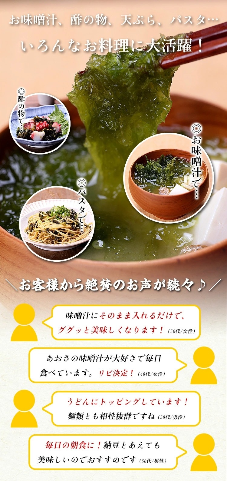 味噌汁の中に入れる他にも、雑炊や卵焼き、パスタ、酢の物、天ぷら…いろんなお料理にご利用いただけます。 |