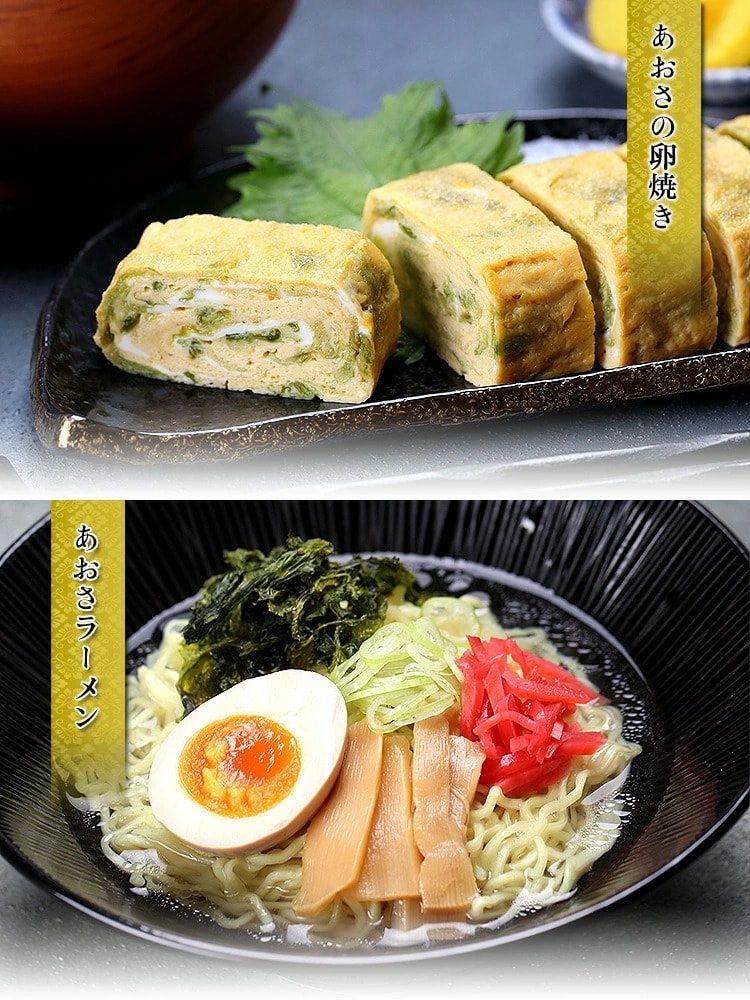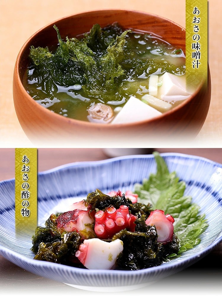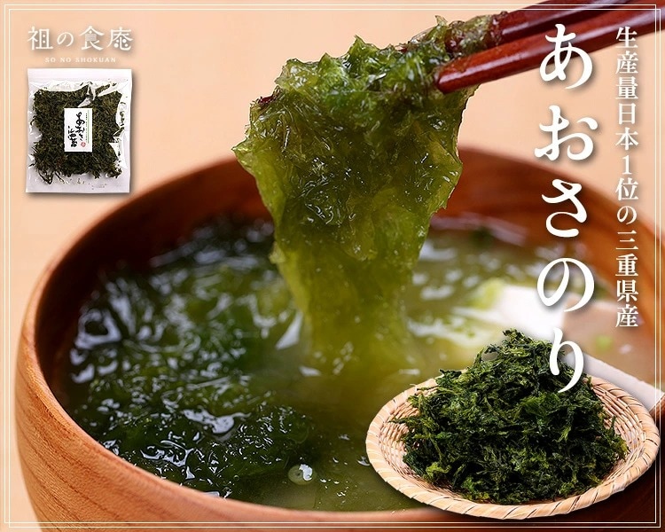 | 生産量日本一の三重県産ヒトエグサ(あおさのり)を厳選しました。三重県は全国の約70%の生産量を誇る一大生産地です。その上質なあおさのりを柔らかな質感と色・香りとともに申し分ない一品に仕上げました。見た目に美しい緑色のあおさは、普段の食生活に、また健康食品としても人気です。味噌汁の中に入れる他にも、雑炊や玉子焼き、酢の物、天ぷら、パスタ…色々な食べ方でご使用いただけます。海藻は脂質が限りなくゼロに近く、きわめて低カロリー。糖質・たんぱく質・ミネラルを主成分とし、活性アミノ酸カルシウムや食物繊維を多く含んでいます。一度にたくさん食べられるものではありませんが、朝食の味噌汁に入れたり、酢の物やサラダなど、毎日少量ずつ食膳に載せてコンスタントにとるのがお勧めです♪ |