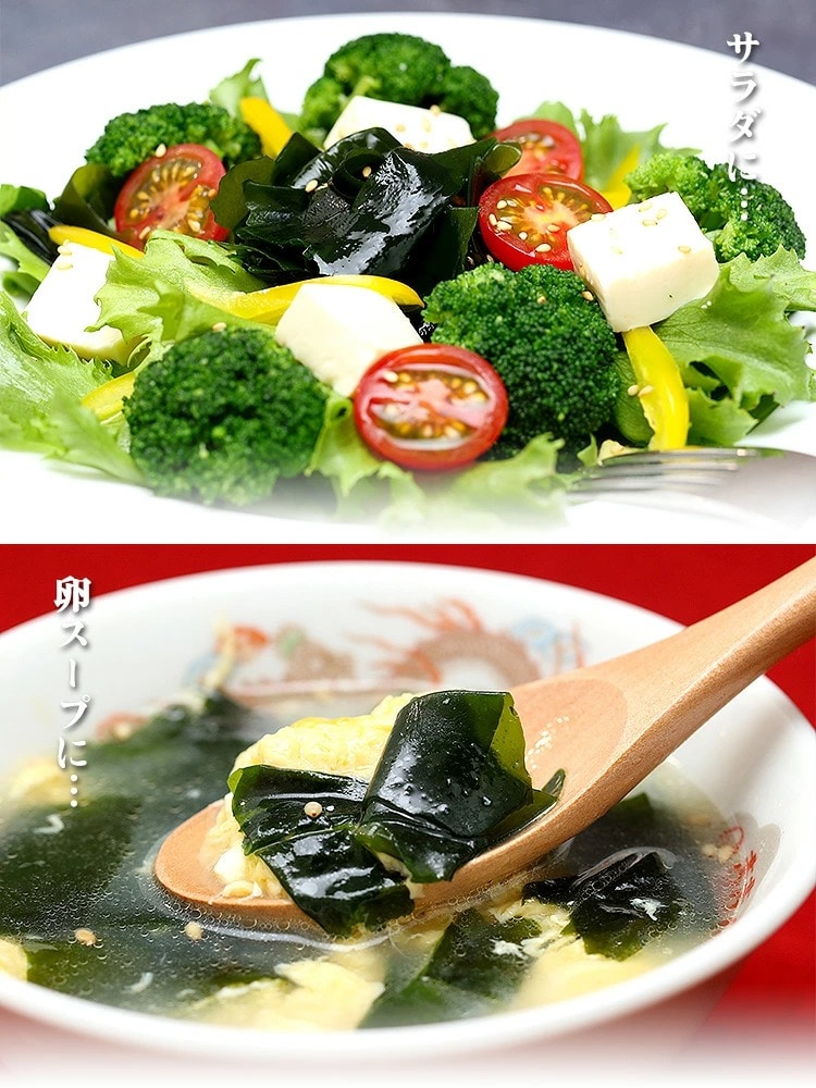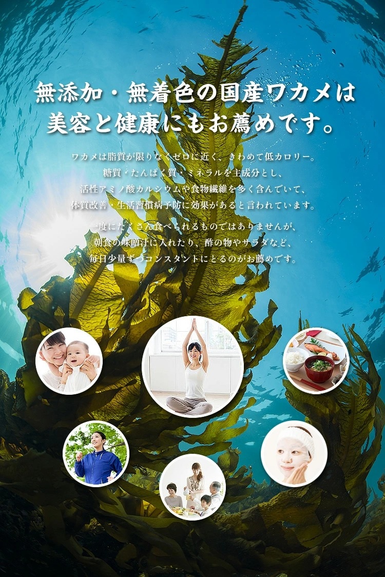| ◎海藻の宝庫!三陸の荒波にもまれた極上ワカメを厳選! ◎安心安全の無添加・無着色でお届け! ◎肉厚があり、濃い緑色と歯ごたえ、磯の香りが特徴! ◎乾燥カット済みなので保存も使い勝手も抜群! ◎美容と健康に♪カルシウムやミネラル、食物繊維がたっぷり! ◎酢の物、サラダ、てんぷら、味噌汁、雑炊、スープなどに… 「味噌汁、酢の物、うどん…いろんな食べ方で毎日食べています」 「歯ごたえがしっかりして磯の香りも抜群の美味しいワカメです」 「水で戻すと笑えるくらい増えます(笑)入れすぎ注意!」 「乾燥ワカメは保存もしやすく使い勝手もいいので重宝しています♪」 …などなど、絶賛のお声が続々♪ 海藻は脂質が限りなくゼロに近く、きわめて低カロリー。糖質・たんぱく質・ミネラルを主成分とし、活性アミノ酸カルシウムや食物繊維を多く含んでいます。一度にたくさん食べられるものではありませんが、朝食の味噌汁に入れたり、酢の物やサラダなど、毎日少量ずつ食膳に載せてコンスタントにとるのがお勧めです♪ |