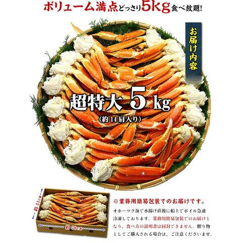 | 超特大ボイルずわいがに足5kg(超特大、14肩前後)<原材料>ロシアオホーツク海産ズワイガニ、塩 |
