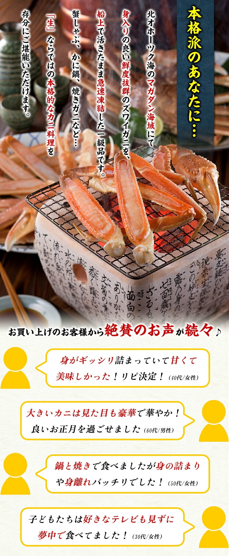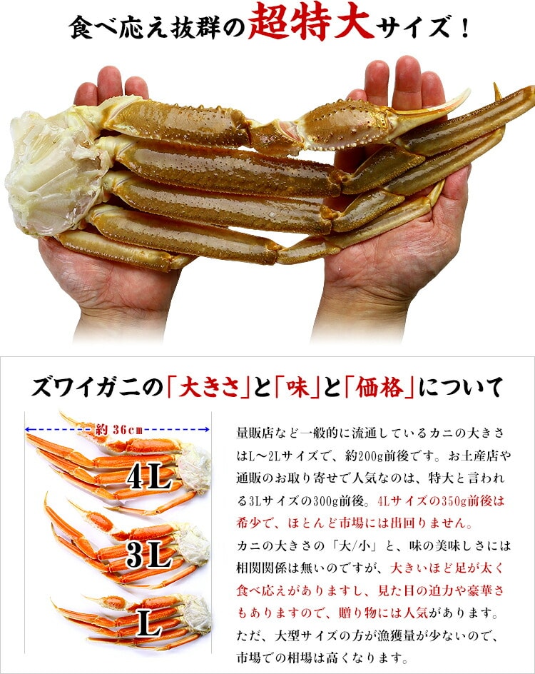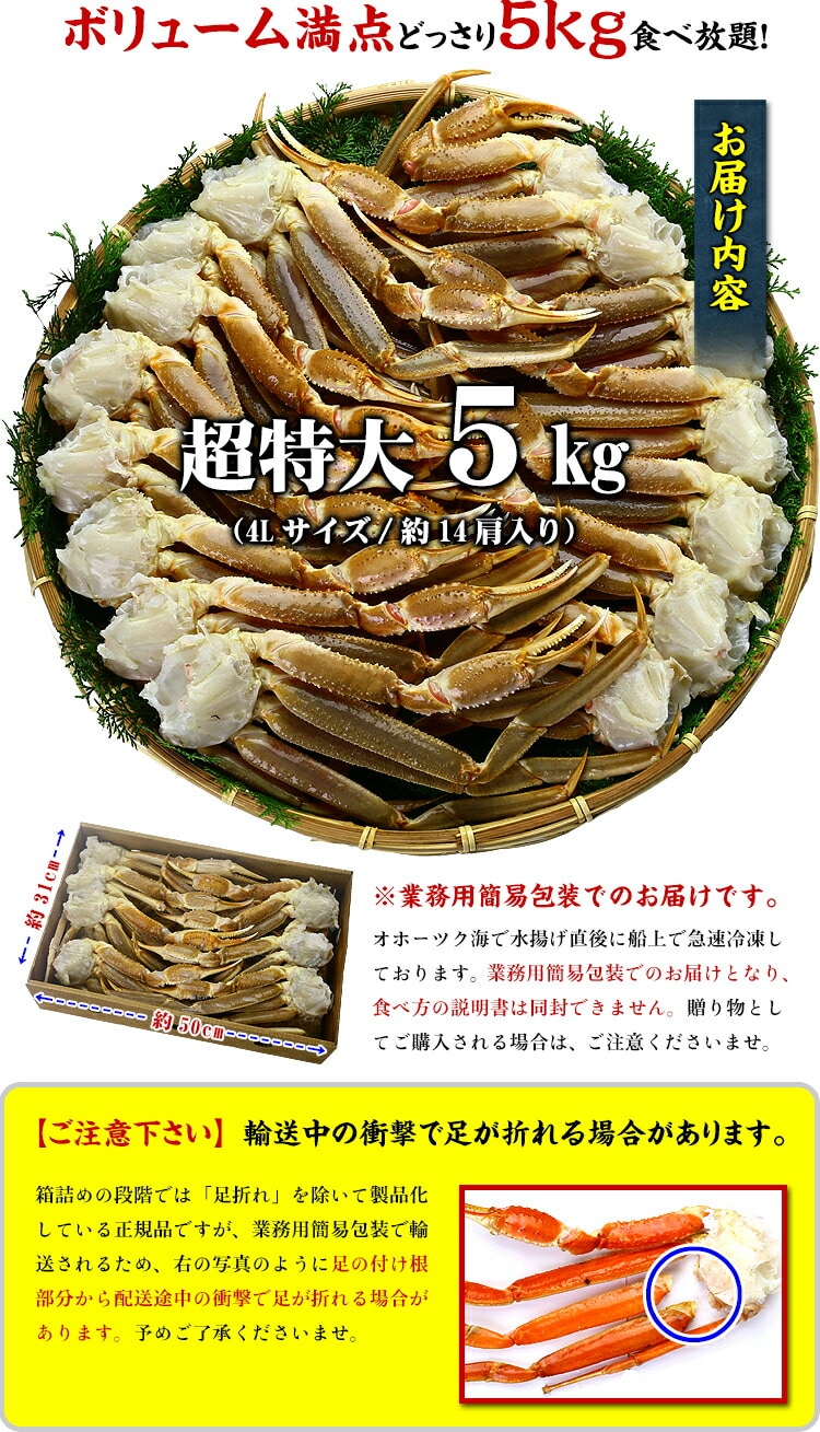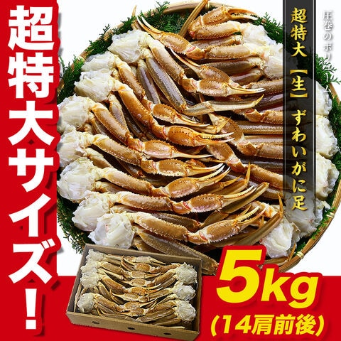| 商品内容 | 超特大生ずわいがに足5kg(約14肩入り)<原材料>ロシア/オホーツク海産ズワイガニ、酸化防止剤 |