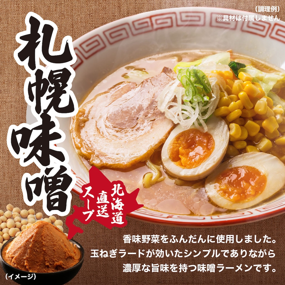 | 【麺の原材料】小麦粉(国内製造)、食塩/酒精、かん水、貝Ca、クチナシ色素、加工でん粉、(一部に小麦を含む) 【札幌味噌スープ】味噌(国内製造)、米発酵調味料、動物油脂、醤油、砂糖、食塩、にんにく、香辛料、生姜、ごま/調味料(アミノ酸等)、pH調整剤、カラメル色素、(一部に小麦・大豆・豚肉・ごま・ゼラチンを含む) |