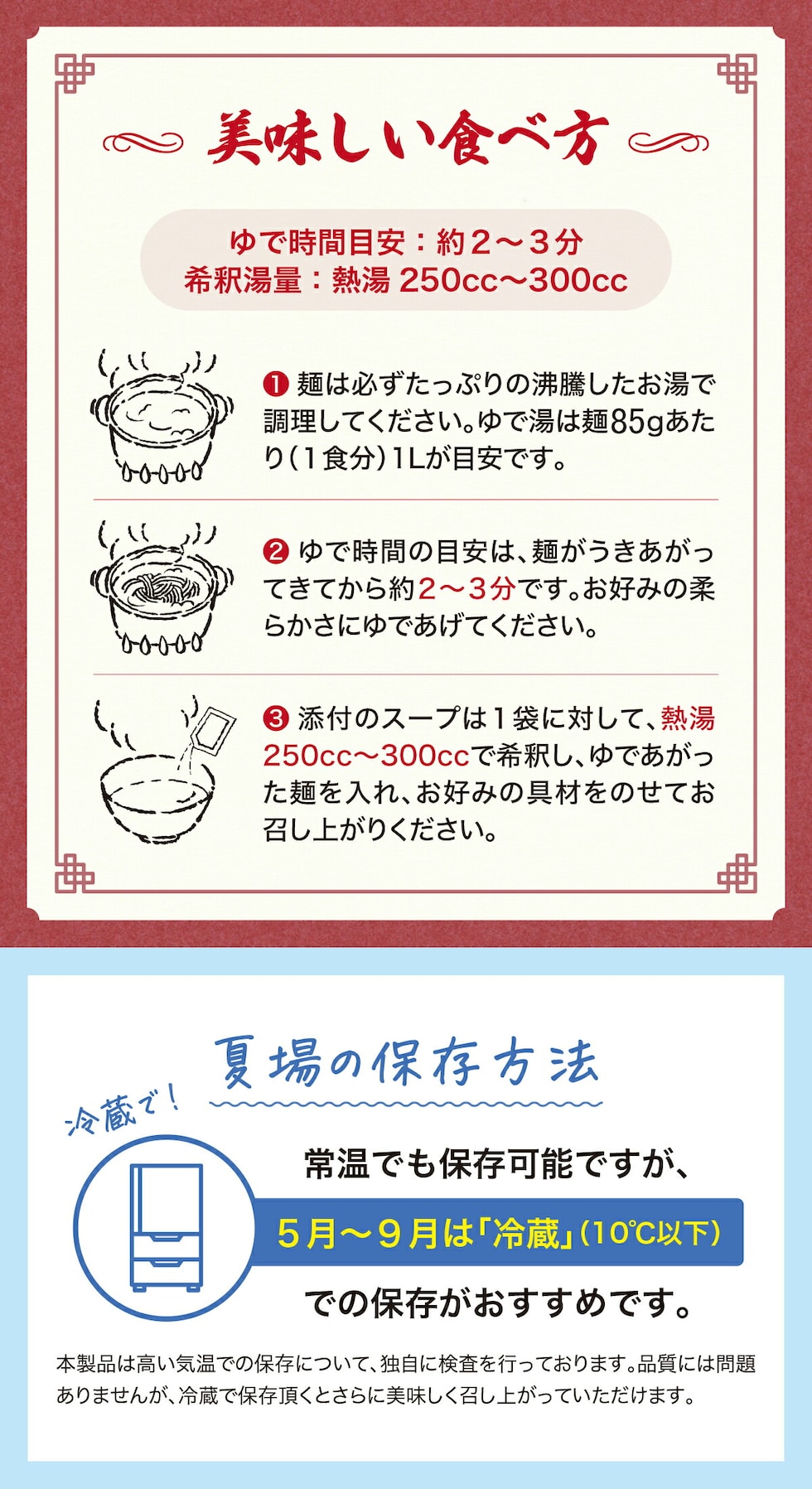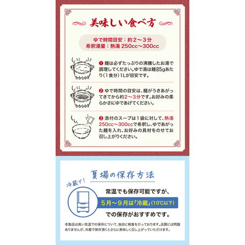 | 【1】麺は必ずたっぷりの沸騰したお湯で調理してください。 ゆで湯は麺90gあたり(1食分)1リットルが目安です。 【2】ゆで時間の目安は、麺がうきあがってきてから約2~3分です。 お好みの柔らかさに茹で上げてください。 【3】添付のスープは1袋に対して、熱湯250cc~300ccで希釈し、 茹で上がった麺を入れ、お好みの具材をのせてお召し上がりください。 |