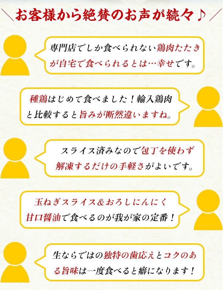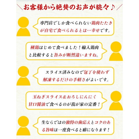 「専門店でしか食べられない鶏肉たたきが自宅で食べられるとは…幸せです。」 |