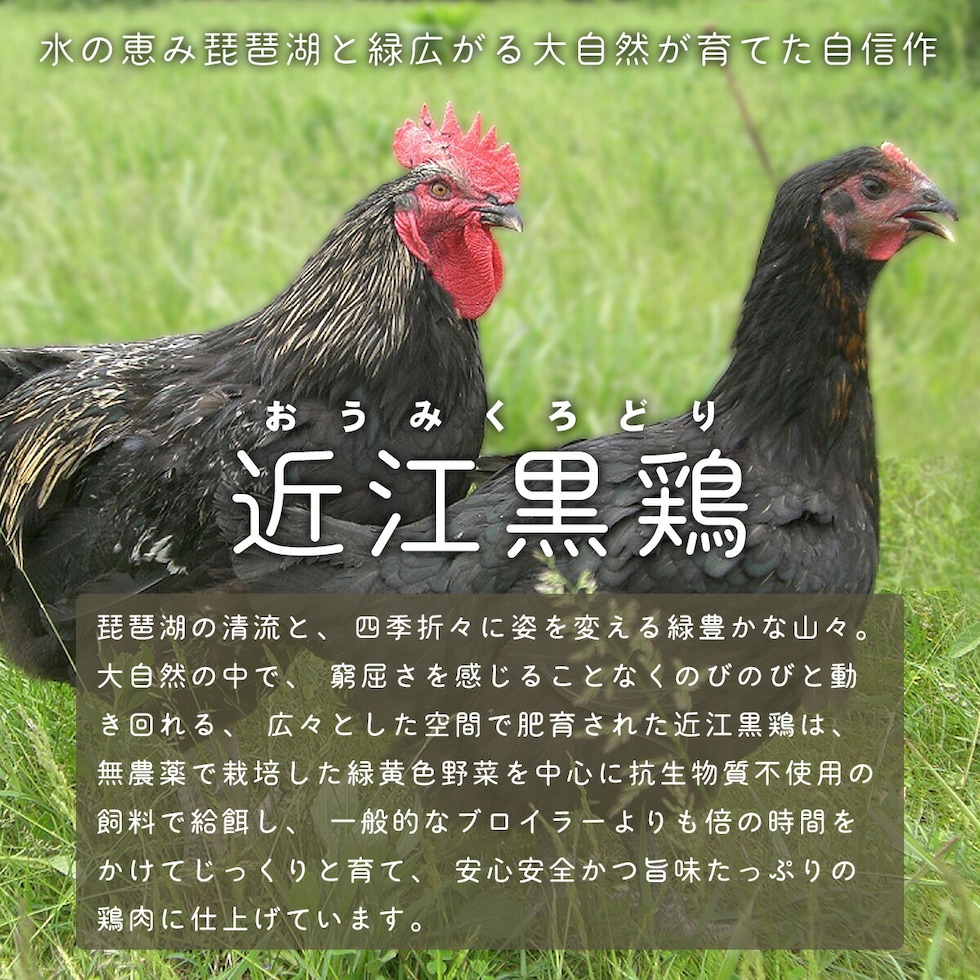 琵琶湖の清流と、四季折々に姿を変える緑豊かな山々。大自然の中で窮屈さを感じることなくのびのびと育った近江黒鶏は、一般的なブロイラーの飼育期間の2倍の95日を経て出荷されます。大自然の中「開放鶏舎」にてのびのびじっくり十分に運動をさせることで、鶏肉本来の旨みが凝集されています。 |