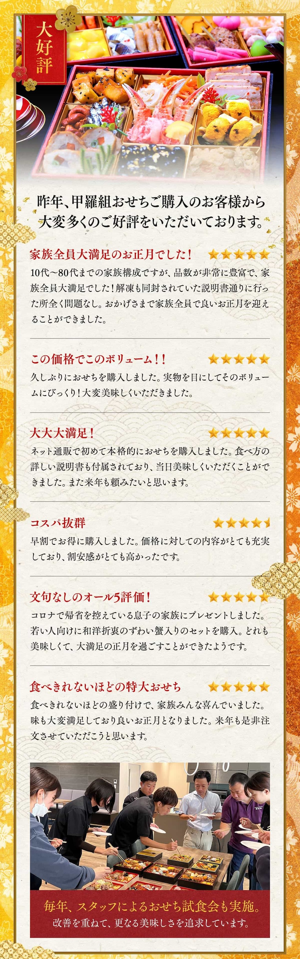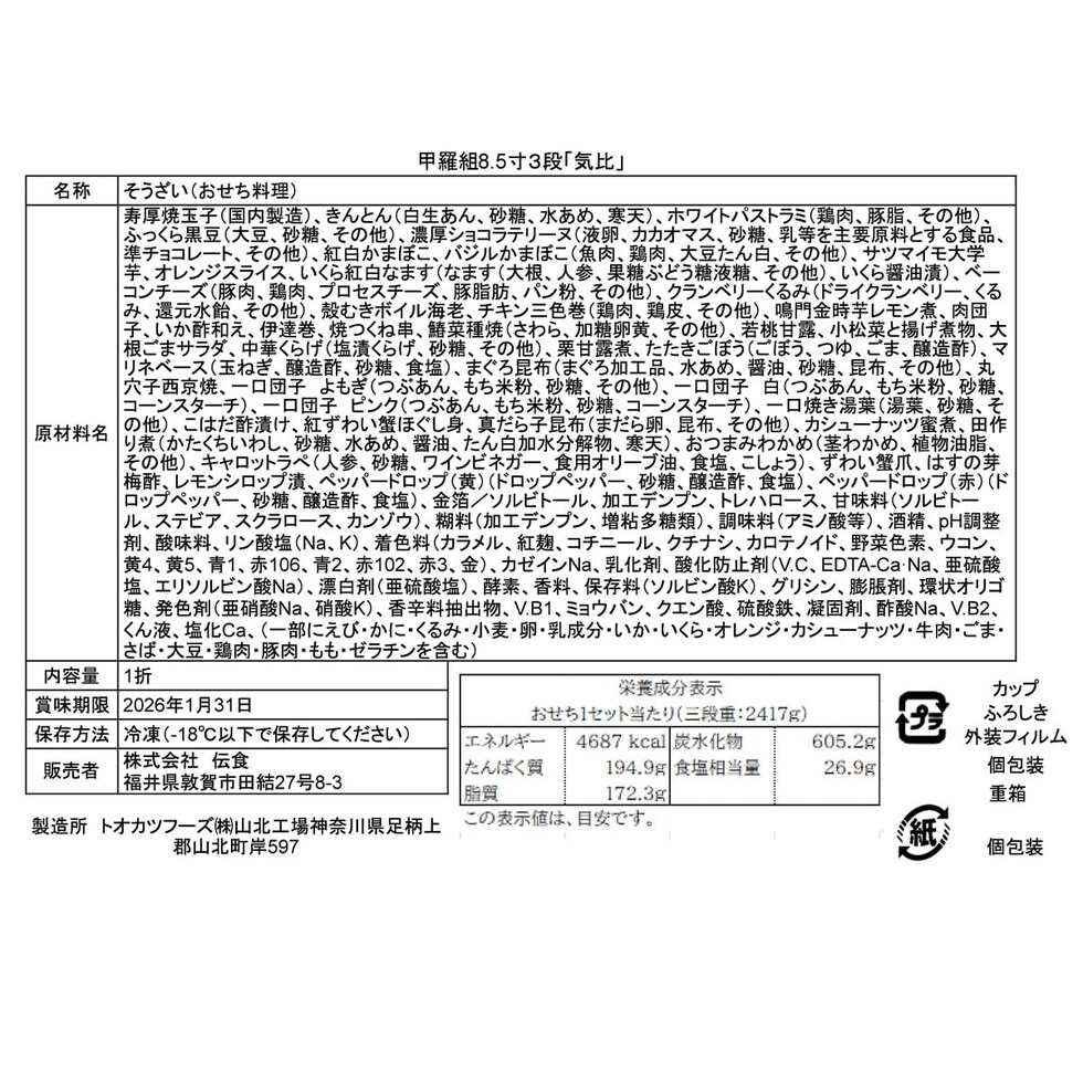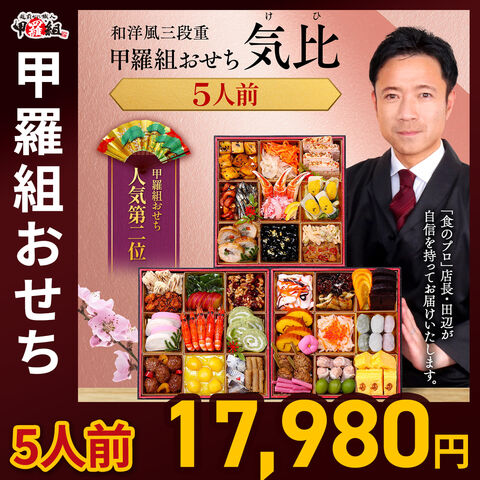 送料無料17,980円!甲羅組おせち「気比」 特大8.5寸×3段 5人前 盛り付け済み 冷凍 主原料に中国産不使用 冷凍食品 おせち お歳暮 歳暮 お年賀 お取り寄せ