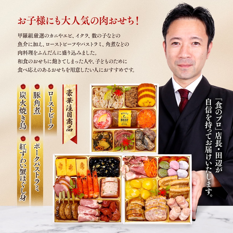 送料無料18,980円!子どもが喜ぶ♪甲羅組の贅沢肉おせち「野坂」6.5寸 和洋風 3段重 30品 3~4人前 盛り付け済み 冷凍 主原料に中国産不使用 冷凍食品 オードブル おせち お歳暮 歳暮 お年賀 お取り寄せ