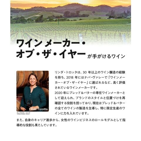 (Bread&Butter Merlot) ◇まろやかな口当たりの芳醇メルロー 【産地】アメリカ カリフォルニア 【色・味わい】赤ワイン/フルボディ 【ぶどう品種】メルロー100% 【Alc】13.5% 【ペアリング】鴨肉のソテー ベリーソース、燻製ステーキ、温野菜とラクレットチーズ、ビーフシチュー 【キャップ仕様】コルク |