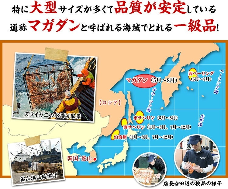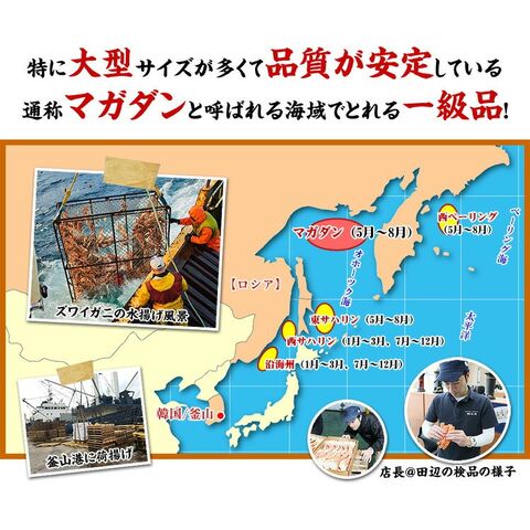 | ◎北オホーツク海のマガダン海域で漁獲される一級品! ◎1尾800gを超える希少な特大サイズを厳選! ◎とれたてを船上で加工する船内凍結品なので鮮度抜群! ◎足の身はもちろん、まったり濃厚なカニミソもたっぷり! ◎蟹しゃぶ、鍋、焼き蟹など、あらゆるカニ料理にお薦め! ! 世界のカニ産地の中でも特に大型サイズが水揚げされるという北オホーツク海のマガダン海域で漁獲されるズワイガニの中から1尾800gを超える特大サイズを厳選しました。春漁と秋漁の2回シーズンがありますが、身の詰まり具合が安定するのは春漁の5月〜6月。カニミソたっぷり♪身もギッシリ!とれたてを船上ですぐさま急速凍結するので鮮度抜群です。鍋や焼きガニを手軽に食べるには足のみを特殊カットした「カット生ずわい蟹」がお薦めですが、濃厚なカニミソも一緒に食べたいならこれに限ります。妥協を許さない本格派のグルメな方には店長一押しです。 |