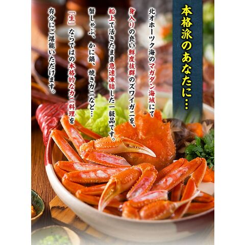 | 生ずわいがに姿800g前後×2尾入り <原材料>ロシア/北オホーツク海産ズワイガニ、酸化防止剤 ※正規品として販売しておりますが、小指(一番下の小さい足)や足の先の一部が欠けている場合がございます。ご了承くださいませ。 |