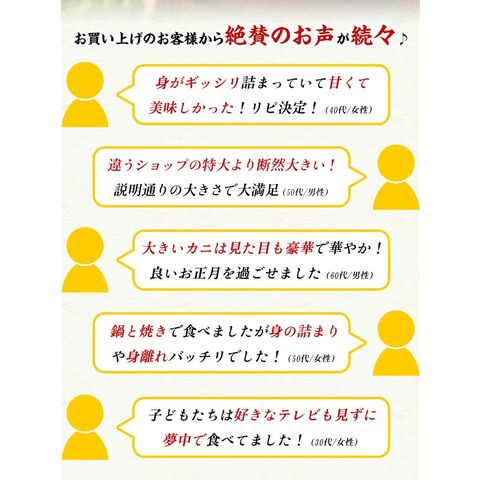 | まず、カニを流水で20分〜30分かけて急速解凍します。あとは鍋や焼きガニ、塩ゆでなど、いろんな食べ方でご堪能いただけます。 ※生食用ではございませんので、必ず加熱してお召し上がりください。 |