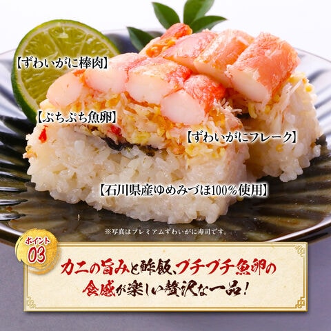 カニ専門店の本格ずわいがに棒寿司 【通常版】 <原材料>ボイルずわいがに(ずわいがに(輸入))、精白米(国産)、とびこ(とびうお卵、しょうゆ、還元水あめ、たん白加水分解物、砂糖、魚醤、発酵調味料、しょうが汁、かつお節エキス、食塩、昆布エキス、醸造酢、昆布抽出物)、すし酢(米酢、砂糖、食塩)、錦糸玉子(鶏卵、でん粉、砂糖、なたね油、食塩、みりん、かつお節エキス)、かにエキス、かつお風味調味料、焼きのり、なたね油、食塩/調味料(アミノ酸等)、酒精、加工デンプン、酸味料、ゲル化剤(ぶどう糖多糖)、乳酸ナトリウム、着色料(黄4、黄5、赤106、赤102)、(一部に小麦・卵・かに・大豆を含む) ※加工地:石川県 |