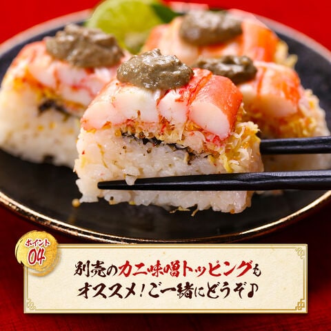 | ◎店長@田辺が吟味した素材を厳選して使用! ◎カニの専門店「甲羅組」が作った特製かに寿司! ◎素材に妥協なし!高級「本ズワイガニ」使用 ◎香り豊かに炊き上げたご飯と心地良い食感のアクセントが絶品♪ ◎彩豊かな食材使用で、見た目も華やか♪ ◎冷凍保存&電子レンジ解凍で使い勝手も抜群です! カニの専門店「甲羅組」に特製カニ寿司が誕生!今回ご紹介するカニ寿司は、味わい豊かな高級「本ズワイガニ」を贅沢に使用した一品です。絶妙な塩加減でボイルした本ズワイガニを秘伝の特製出汁や香り豊かな海苔、心地よい食感のとびっこを混ぜ込んだ特製ご飯と共にお寿司に仕上げておりますので、味はもちろん、香りや食感なども存分にお楽しみいただけます。またカニや錦糸卵等、使用している食材も彩豊かである為、見た目も豪華!冷凍保存&電子レンジで加熱するだけと使い勝手も抜群なので、ご家庭用はもちろん、特別な日のお祝いやギフトなど、様々な場面でお楽しみください♪ |