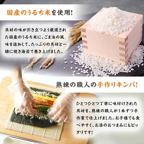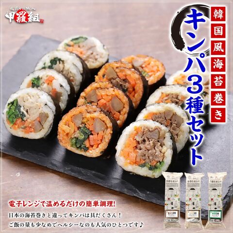プルコギキンパ 1本(10切れ) 270g <原材料> うるち米(国産)、野菜(人参(中国産)、ほうれんそう、ごぼう)、牛肉(輸入)、焼肉 のたれ、食用ごま油、みりん、昆布、焼きのり、ごま、植物油脂、しょうゆ、食塩、砂糖、 醸造調味料/調味料(アミノ酸等)、トレハロース、くん液、アルコール、カラメル色素、 ソルビトール、増粘剤(キサンタン)、酸味料、香料、香辛料抽出物、V.B1、pH調整 剤、(一部に小麦・牛肉・ごま・大豆・鶏肉・りんご・ゼラチンを含む) サムギョプサルキンパ 1本(10切れ) 270g <原材料> うるち米(国産)、野菜(人参(中国産)、ほうれんそう、ごぼう)、豚肉(カナダ産)、 青唐辛子みそ(みそ、砂糖、ねぎ、その他)、食用ごま油、みりん、昆布、焼きのり、植物 油脂、ごま、しょうゆ、食塩、砂糖、塩コショウ、醸造調味料、ガーリックパウダー/調味 料(アミノ酸等)、トレハロース、酸味料、酒精、増粘多糖類、アルコール、着色料(銅葉 緑素)、香料、pH調整剤、(一部に小麦・ごま・大豆・豚肉を含む) ビビンバキンパ 1本(10切れ) 265g <原材料> 野菜(人参(中国産)、ほうれんそう(中国産)、ごぼう)、うるち米(国産)、割り干し 大根キムチ、コチュジャン、牛肉、食用ごま油、みりん、たれ、昆布、焼きのり、しょう ゆ、植物油脂、ごま、砂糖、食塩、醸造調味料/調味料(アミノ酸等)、ソルビトール、酒 精、トレハロース、酸味料、甘味料(ステビア)、着色料(パプリカ色素、パプリカ粉末、 カラメル)、増粘多糖類、保存料(ソルビン酸K)、V.B1、くん液、アルコール、香 料、香辛料抽出物、pH調整剤、(一部に小麦・牛肉・ごま・大豆・鶏肉・りんご・ゼラチ ンを含む) |