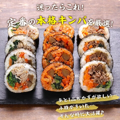 ★大人気の韓国料理「キンパ」登場! ★たっぷりの具材を塩やごま油で味付けした韓国風海苔巻き ★迷ったらこれ!「プルコギ」「サムギョプサル」「ビビンバ」の3種類をご用意 ★「レンジでチンするだけ」の簡単調理♪ ★手軽さにもこだわった「カット済」仕様 プルコギ・サムギョプサル・ビビンバのキンパ3種セットをご紹介! キンパとはたっぷりの具材を塩やごま油で味付けした韓国風の海苔巻きです。 韓国では専門のファーストフード店もあるほど人気で、老若男女に幅広く親しまれています。 日本の海苔巻きと違ってキンパは具だくさん! ご飯の量も少なめでヘルシーなのも人気の理由です。 丁寧に味付けしたたっぷりの具材をごま油の風味が効いたうるち米と焼き海苔で仕上げた当店のキンパは、レンジで加熱するだけの簡単調理・食べやすい「カット済」仕様等、「本場の味」を「お手軽に」楽しむことにもこだわりました。 韓国の味をとても簡単に楽しめる当店のキンパ3種セットをぜひご賞味ください♪ |