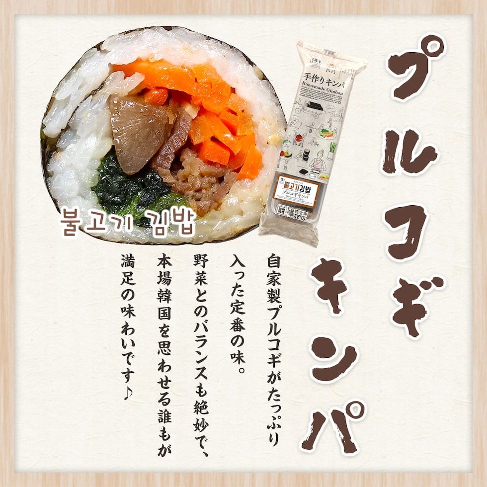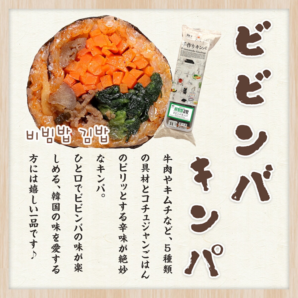プルコギキンパ 1本(10切れ) 270g <原材料> うるち米(国産)、野菜(人参(中国産)、ほうれんそう、ごぼう)、牛肉(輸入)、焼肉 のたれ、食用ごま油、みりん、昆布、焼きのり、ごま、植物油脂、しょうゆ、食塩、砂糖、 醸造調味料/調味料(アミノ酸等)、トレハロース、くん液、アルコール、カラメル色素、 ソルビトール、増粘剤(キサンタン)、酸味料、香料、香辛料抽出物、V.B1、pH調整 剤、(一部に小麦・牛肉・ごま・大豆・鶏肉・りんご・ゼラチンを含む) サムギョプサルキンパ 1本(10切れ) 270g <原材料> うるち米(国産)、野菜(人参(中国産)、ほうれんそう、ごぼう)、豚肉(カナダ産)、 青唐辛子みそ(みそ、砂糖、ねぎ、その他)、食用ごま油、みりん、昆布、焼きのり、植物 油脂、ごま、しょうゆ、食塩、砂糖、塩コショウ、醸造調味料、ガーリックパウダー/調味 料(アミノ酸等)、トレハロース、酸味料、酒精、増粘多糖類、アルコール、着色料(銅葉 緑素)、香料、pH調整剤、(一部に小麦・ごま・大豆・豚肉を含む) ビビンバキンパ 1本(10切れ) 265g <原材料> 野菜(人参(中国産)、ほうれんそう(中国産)、ごぼう)、うるち米(国産)、割り干し 大根キムチ、コチュジャン、牛肉、食用ごま油、みりん、たれ、昆布、焼きのり、しょう ゆ、植物油脂、ごま、砂糖、食塩、醸造調味料/調味料(アミノ酸等)、ソルビトール、酒 精、トレハロース、酸味料、甘味料(ステビア)、着色料(パプリカ色素、パプリカ粉末、 カラメル)、増粘多糖類、保存料(ソルビン酸K)、V.B1、くん液、アルコール、香 料、香辛料抽出物、pH調整剤、(一部に小麦・牛肉・ごま・大豆・鶏肉・りんご・ゼラチ ンを含む) |