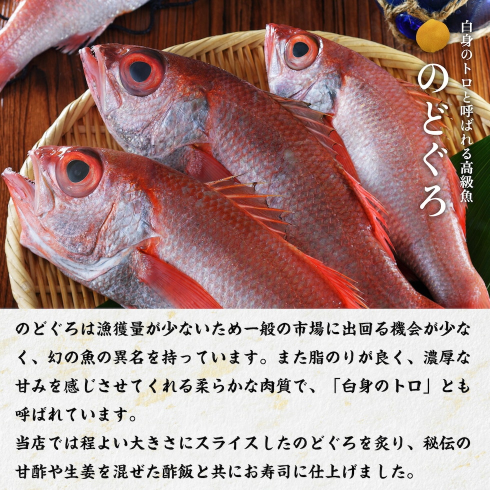 ★高級魚「のどぐろ」使用のお寿司が登場! ★秘伝の甘酢と生姜を混ぜた酢飯がのどぐろと相性バッチリ♪ ★独自の冷凍技術で素材の細胞を傷つけず美味しさそのまま! ★煌びやかな金粉で見た目も豪華♪ ★冷凍保存&電子レンジ解凍で保存・調理もカンタン! のどぐろ」は正式名称「赤ムツ」と言われていますが、口を開けて中を覗くと喉のあたりが黒いため、北陸地方では通称「のどぐろ」と呼ばれ流通しています。 東北・北陸以南・日本海・太平洋に広く分布していますが、漁獲量が少ないため一般の市場に出回る機会が少なく、幻の魚の異名を持っています。 またのどぐろは一年を通して脂のりが良く、濃厚な甘みを感じさせてくれる柔らかな肉質で、「白身のトロ」とも呼ばれるほど脂が強い魚です。 その為、当店では程よい大きさにスライスしたのどぐろを炙り、秘伝の甘酢や生姜を混ぜた酢飯と共にお寿司に仕上げることで、素材の旨味を引き立てつつ、脂の強さに負けることのない、食べやすいお寿司に仕上げました。 見た目に豪華な金粉もつけて化粧箱でお届けしますので、ご自宅用はもちろん、ギフトなどでもご利用ください♪ |