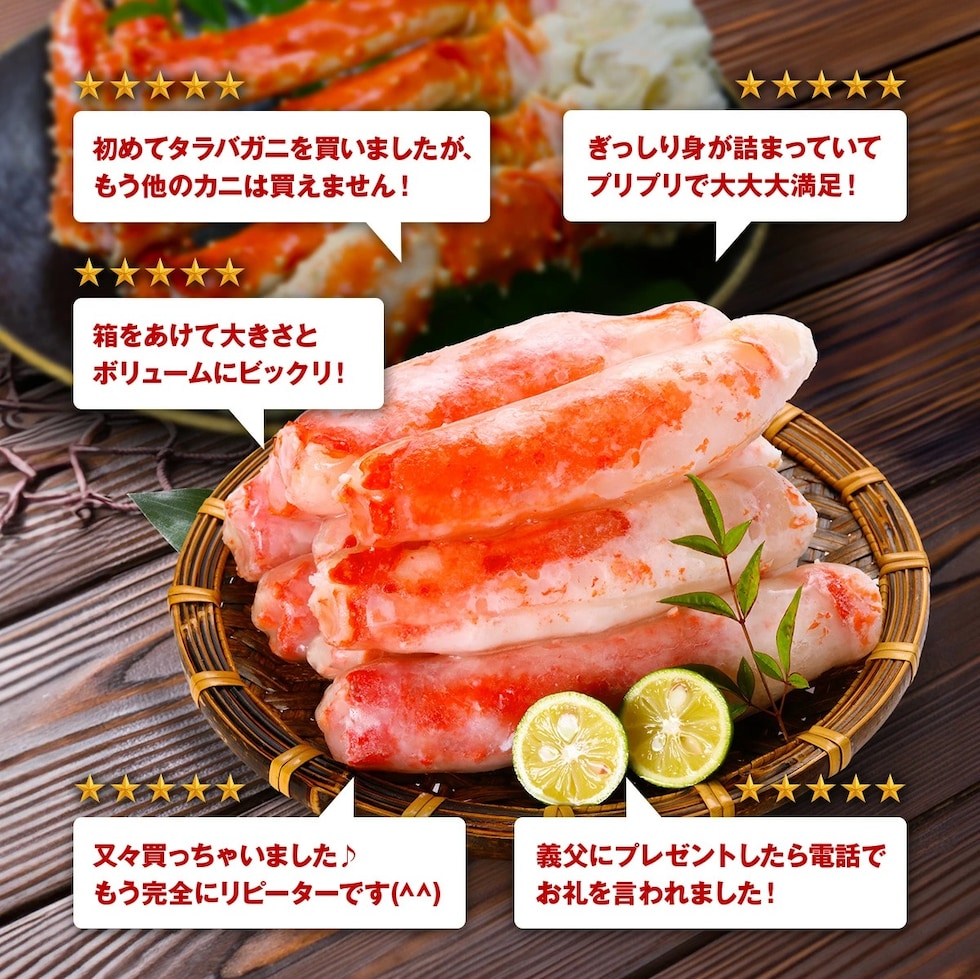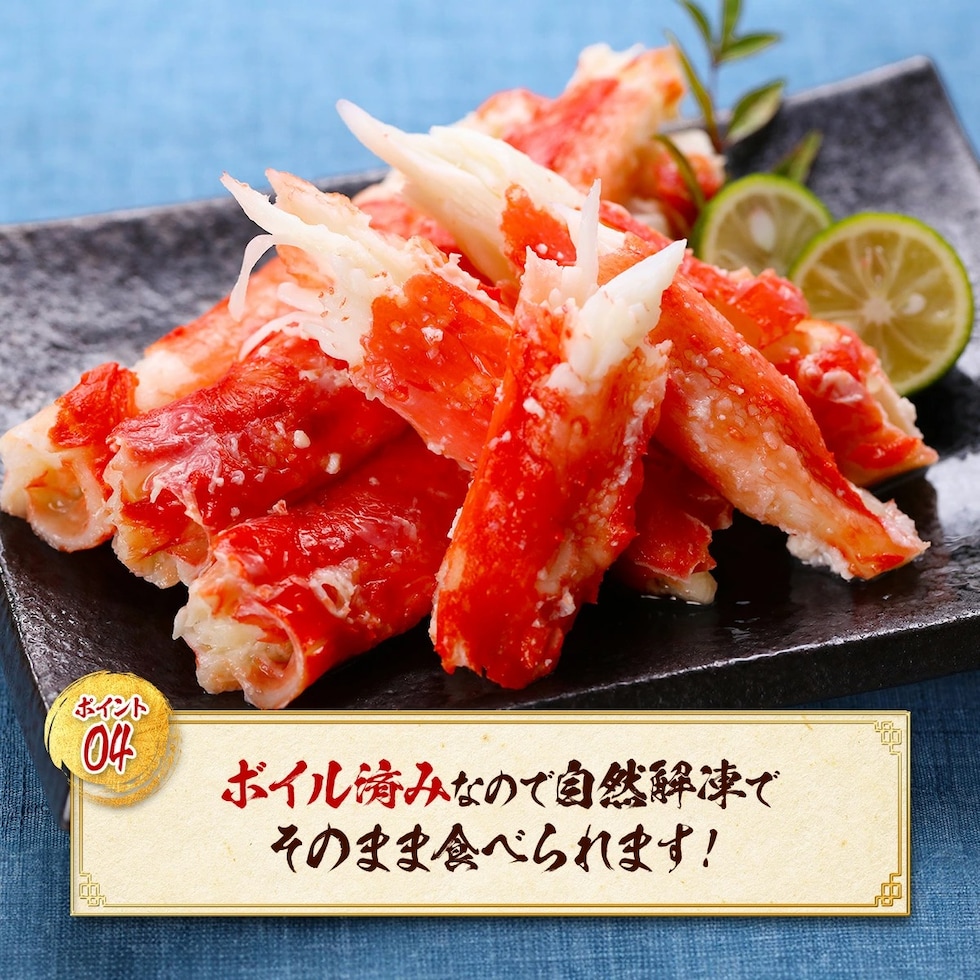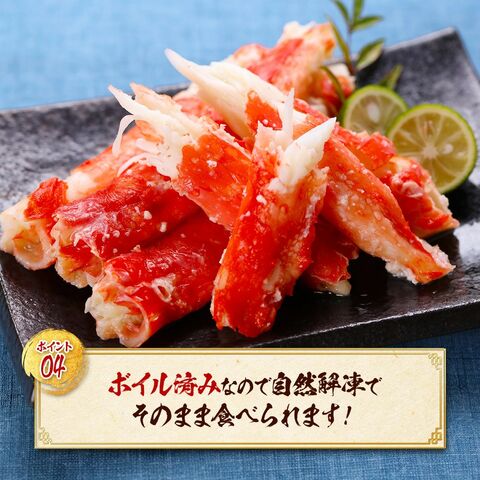 | ≪解凍方法≫ 食べる分だけ冷凍庫から出してボールに入れます。直接、流水をあてて、カニ表面の氷の膜を洗い落してください。カニの芯は凍っていてOKです。表面の氷の膜がとけたらキッチンペーパーで水気を取り、お皿の上にのせて1時間ほどで解凍してください。 ※水の中で完全解凍すると、カニの旨みが抜けて水っぽくなるのでご注意下さい。 ≪お召し上がり方≫ 絶妙の塩加減でボイルしてありますので、まずはそのままお召し上がりください。お好みで三杯酢やポン酢を付けても美味しいです。 |