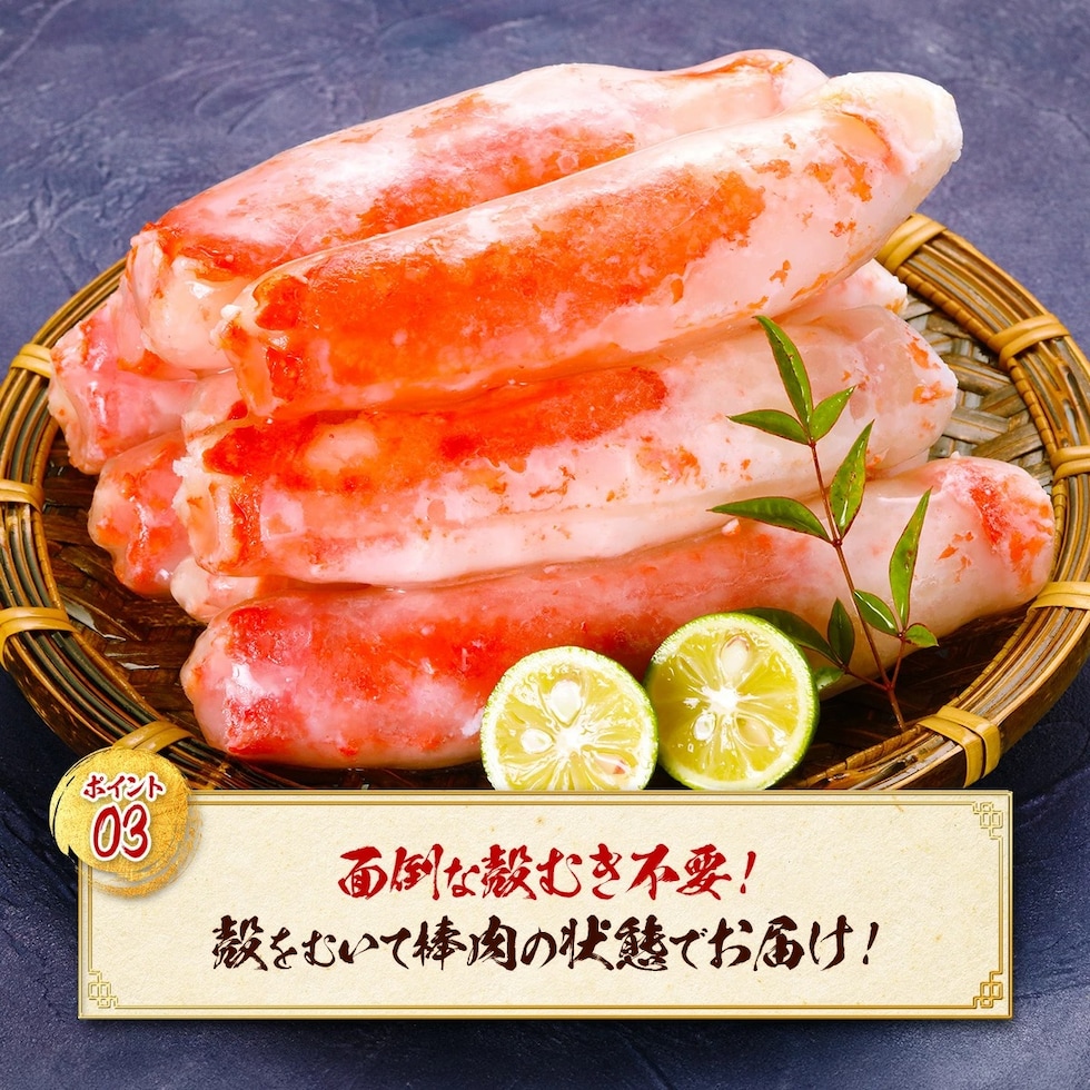 | ボイルたらばがに足むき身:1kg(解凍後800g)4~9本入り 原材料:タラバガニ ロシア産のタラバガニをベトナムの工場で殻むき作業をしています。 |