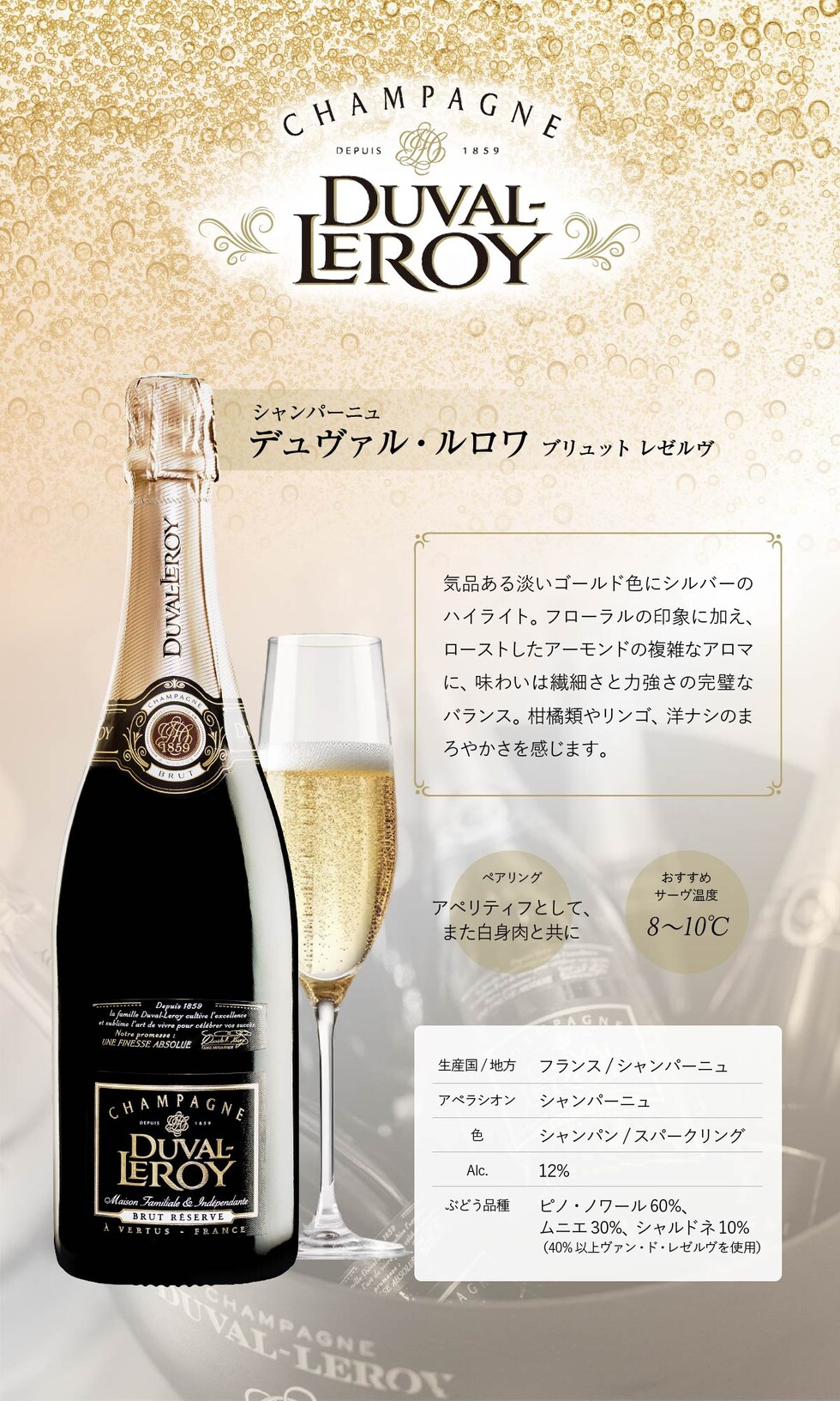 シャンパーニュ最高峰!世界の三ツ星レストランや著名ホテルで提供されている一流の味♪ デュヴァル・ルロワ ブリュット レゼルヴ [NV] 750ml フランス シャンパン 白ワイン スパークリングワイン ギフト 贈り物 お祝い 送料無料 年末年始 正月 お歳暮 クリスマス