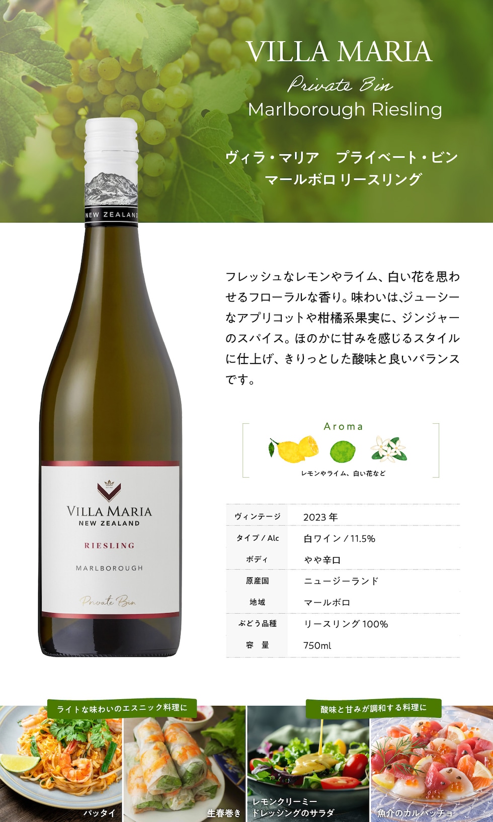 アペリティフとして、またパッタイ、生春巻きなどライトな味わいのエスニック、 レモンクリーミードレッシングのサラダなどの爽やかな酸味とほのかな甘みが調和するお料理にも |
