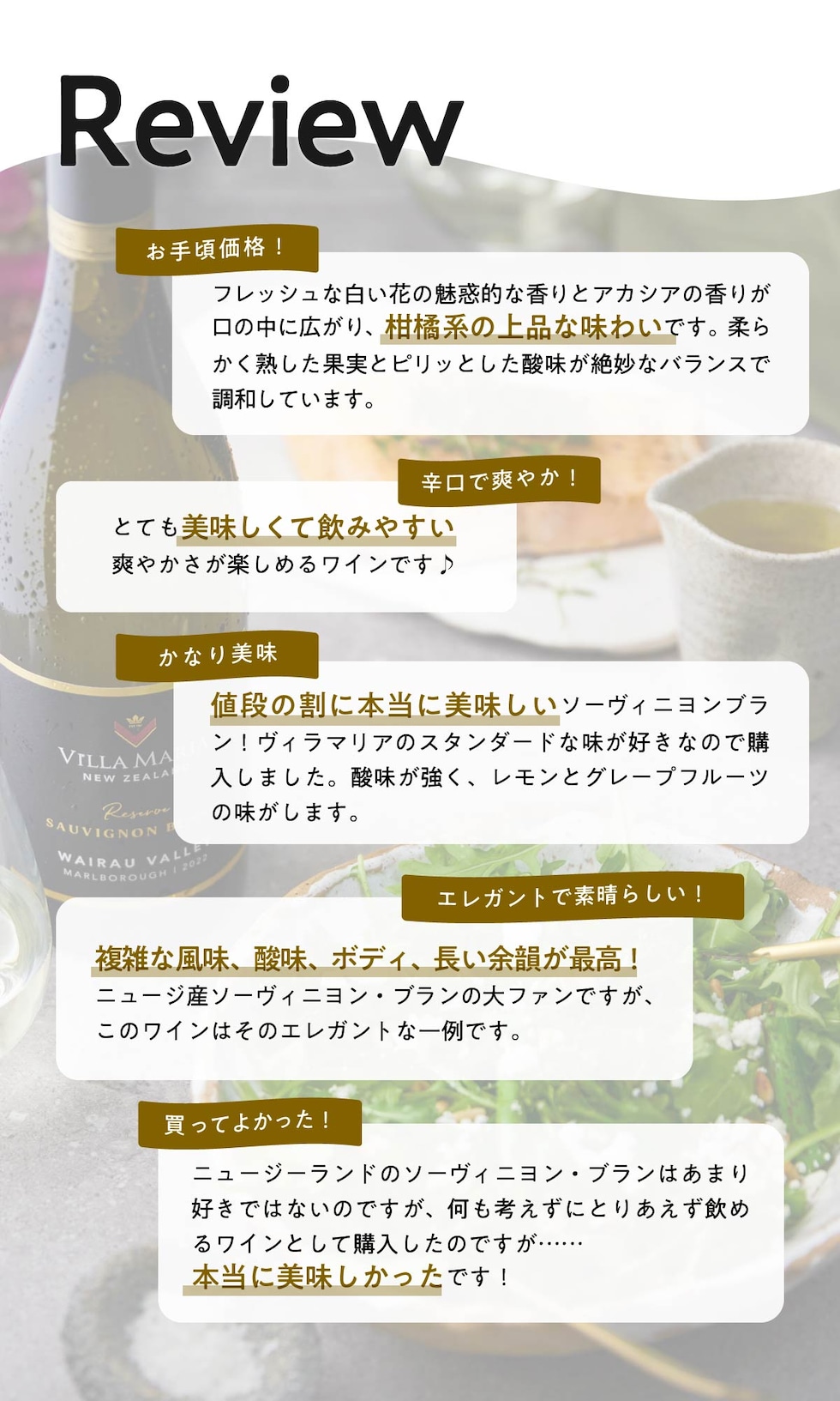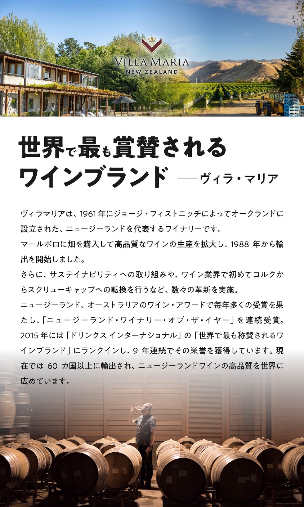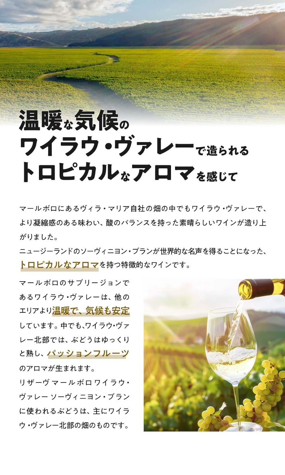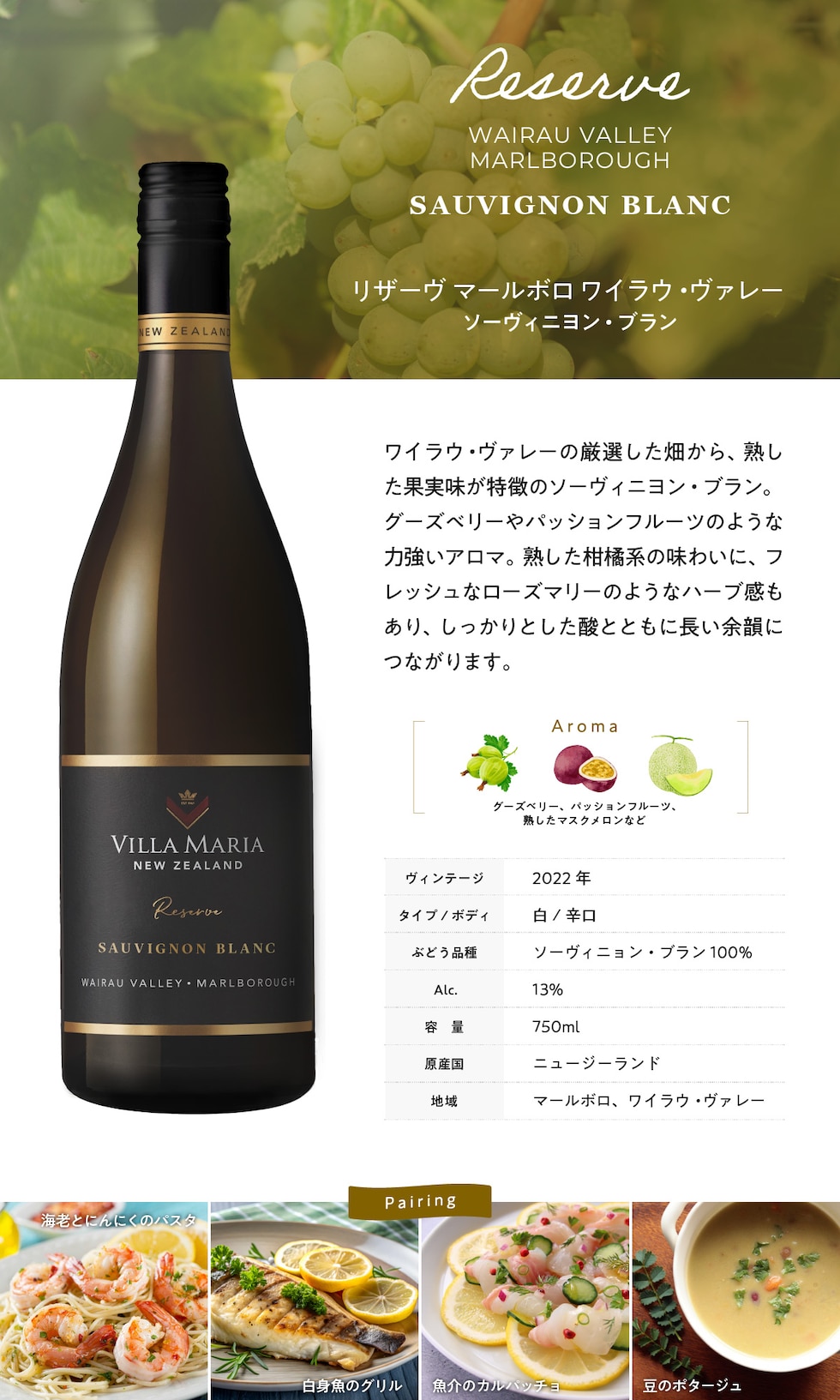 | ワイラウ・ヴァレーの厳選した畑から、熱し た果実味が特徴のソーヴィニヨン・ブラン。 グーズベリーやパッションフルーツのような 力強いアロマ。熟した柑橘系の味わいに、フ レッシュなローズマリーのようなハーブ感も あり、しっかりとした酸とともに長い余韻に つながります。 |