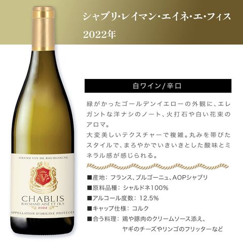 (CHABLIS RAYMAND AINÉ ET FILS) 【産地】フランス、ブルゴーニュ、A.O.P シャブリ 【色・味わい】白ワイン/辛口 【ぶどう品種】シャルドネ100% 【Alc】12.5% 【商品詳細】 緑がかったゴールデンイエローの外観に、エレガントな洋ナシのノート、火打石や白い花束のアロマ。 大変美しいテクスチャーで複雑。丸みを帯びたスタイルで、まろやかでいきいきとした酸味とミネラル感が感じられる。 【ペアリング】 鶏や豚肉のクリームソース添え、ヤギのチーズやリンゴのフリッターなど 【キャップ仕様】コルク |