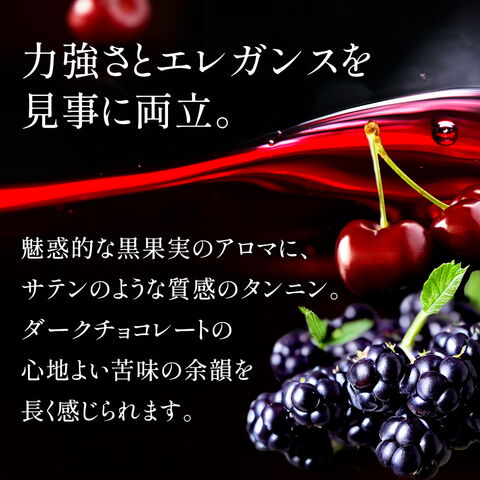カベルネ・ソーヴィニヨン主体のボルドーブレンドで、プラムやブラックベリー、チェリーの華やかな果実香に、バラの花や土を思わせる複雑なニュアンスが調和。シルクのようになめらかなタンニンと、コーヒーやダークチョコを感じさせる余韻が長く続きます。