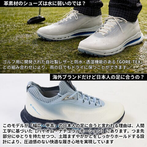 ・アッパーはゴルフ用に開発された防水パフォーマンスレザーを使用しており、傷つきにくく、メンテナスやクリーニングが簡単。