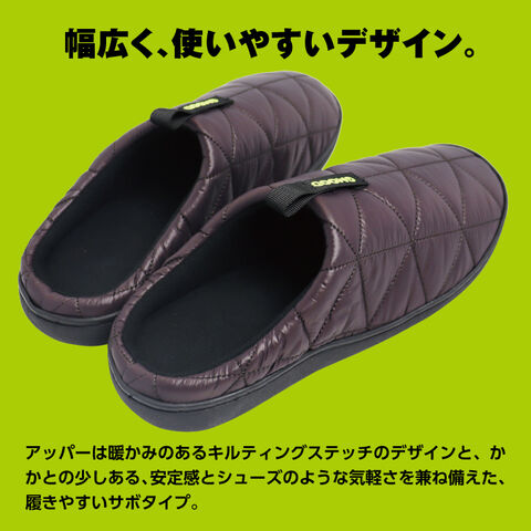 アッパーは暖かみのあるキルティングステッチのデザインと、かかとの少しある、安定感とシューズのような気軽さを兼ね備えた、履きやすいサボタイプ。