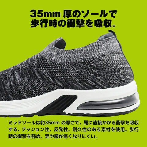 ミッドソールは約35mmの厚さで、靴に直接かかる衝撃を吸収する、クッション性、反発性、耐久性のある素材を使用。