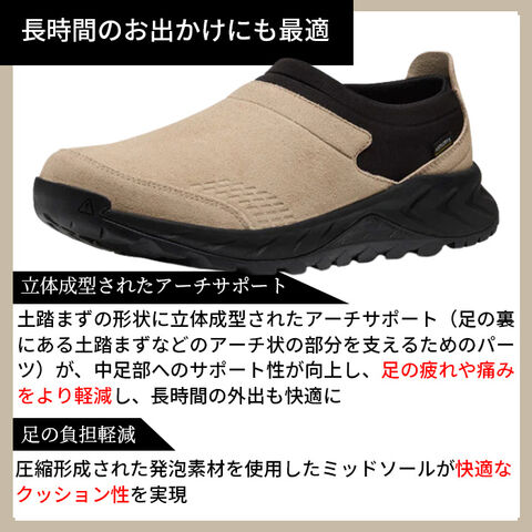 脱ぎ履きの容易なスリッポンデザインではっ水処理を施したスエードアッパーにKEEN独自の防水機能を搭載、