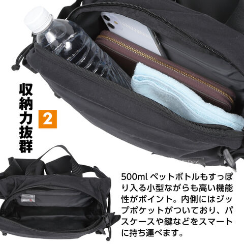 500mlペットボトルもすっぽり入る小型ながらも高い収納性と機能性に溢れたバッグです。