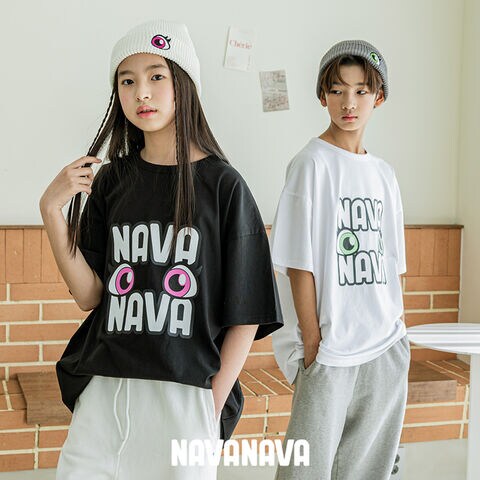 ナバナバ Tシャツ 目玉ロゴ カットソー 子供服 男の子 女の子 韓国 ファッション 半袖 韓流 ストリート 男女兼用 ビックサイズ オーバーサイズ ダンス 衣装 ヒップホップ おしゃれ かわいい ゆったり 小学生 中学生 NAVANAVA