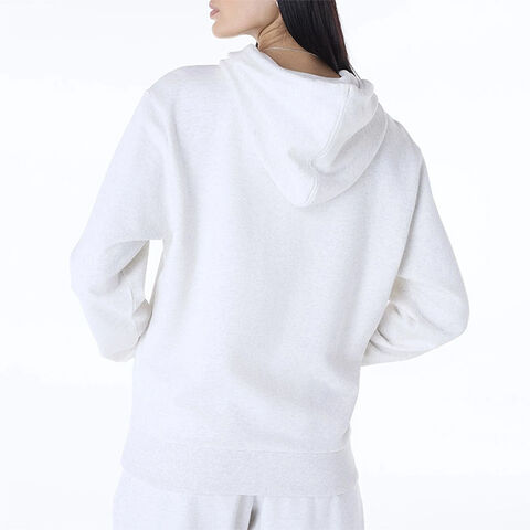 胸の刺繍が映えるホワイトなフーディー(フードが付いたスウェットシャツのこと)