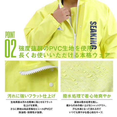 POINT 02▼強度抜群のPVC生地を使用。長くお使いいただける本格ウェア