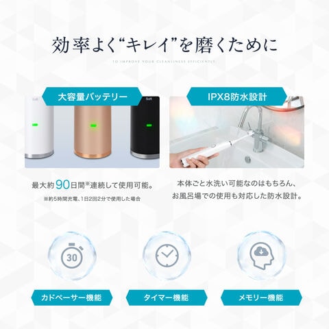いつまで磨けばいいか分からないといった不安の解消のため、2分間(専門家推奨の歯磨き時間)のブラッシング後、自動で停止します。