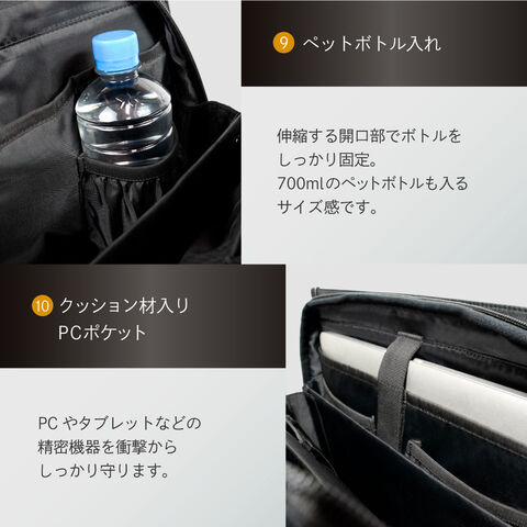 13.3インチPCやA4ファイル・ペットボトルなど出張や資料の持ち運びに最適なサイズ感です。